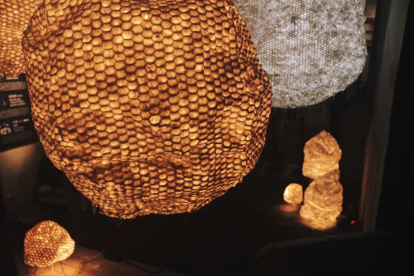 「纖維雕塑」– 胚胎活動的肌理,運用傳統手抄紙技法,發展平面與空間之間的可能性,以植物纖維結合軟雕塑的技法,呈現有如巢、胎一般的視覺肌理。