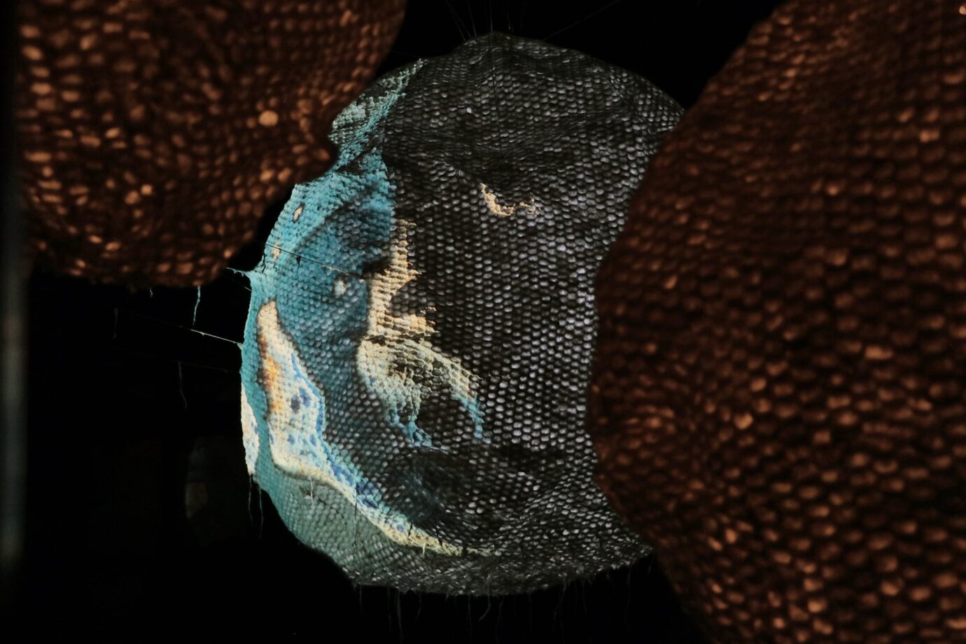 「油水投影」– 胚胎流動的血液,以油水分離的原理進行視覺創作,液態光雕投影在纖維雕塑上,展現有如血液跟羊水一般在胚胎上自然有機的流動。