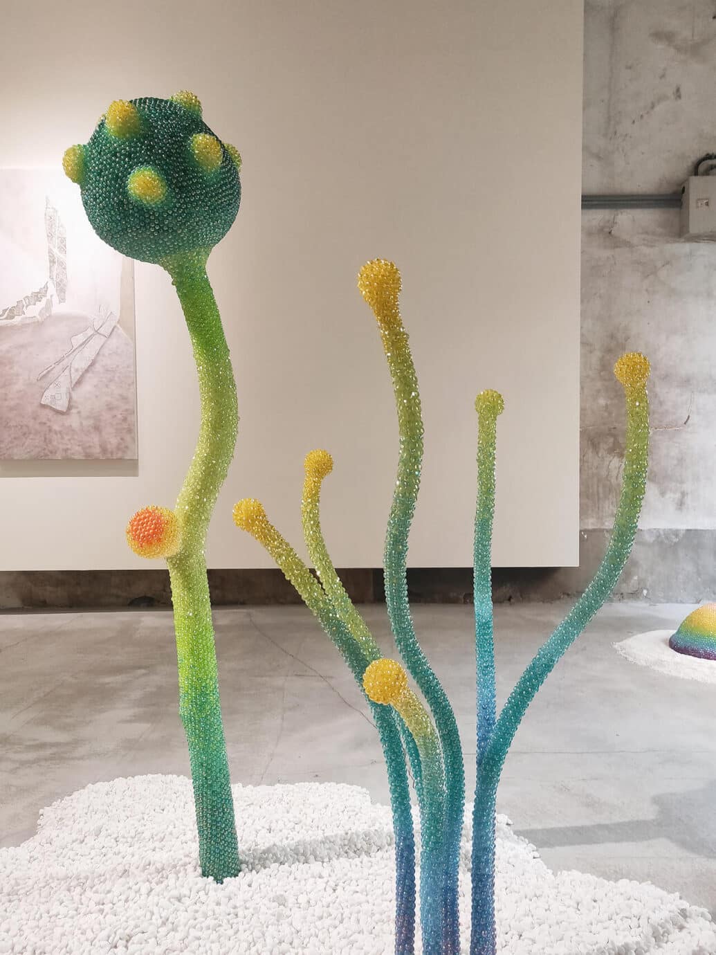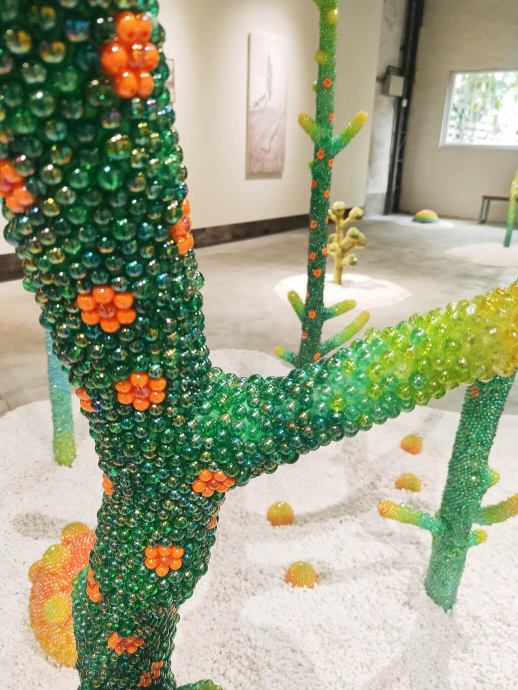 另一位藝術家黃蘭雅的作品《異想森林》,則是以許多珠子所製成的樹木裝置,看似由人工物件所組成的裝置之下,其實都有著真實的自然樹體,這些樹體被乾燥處理過後,再以自然與人工素材的結合表現出新樣態的森林。