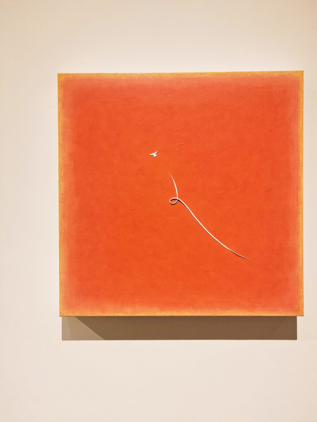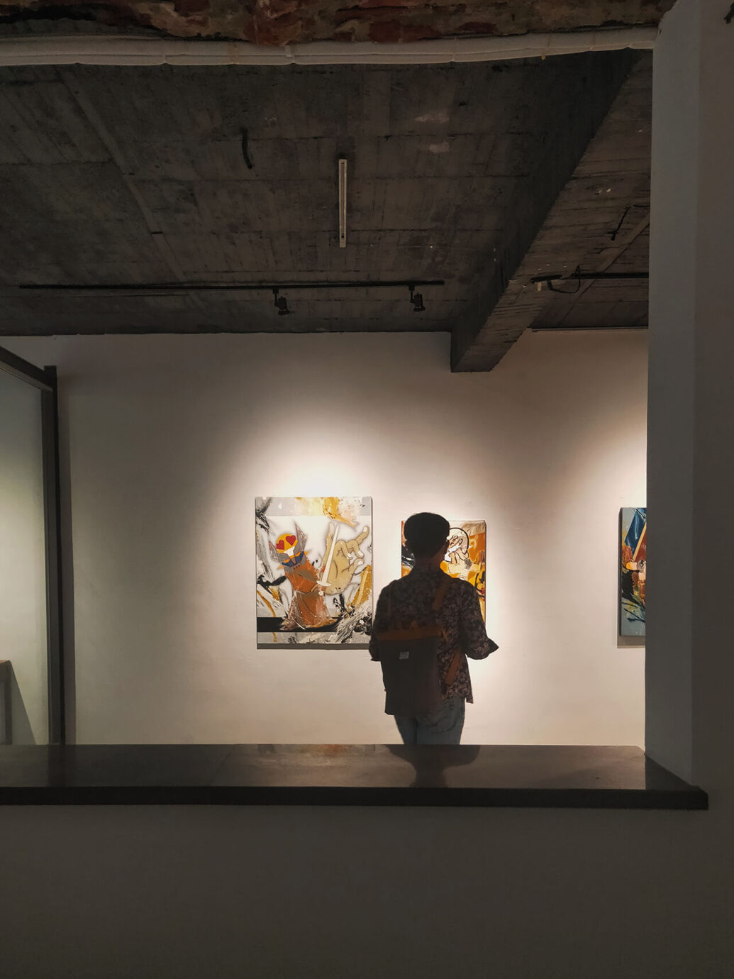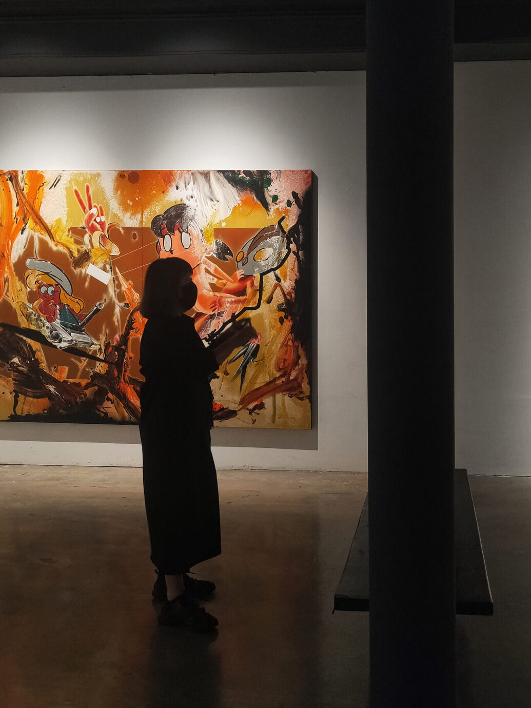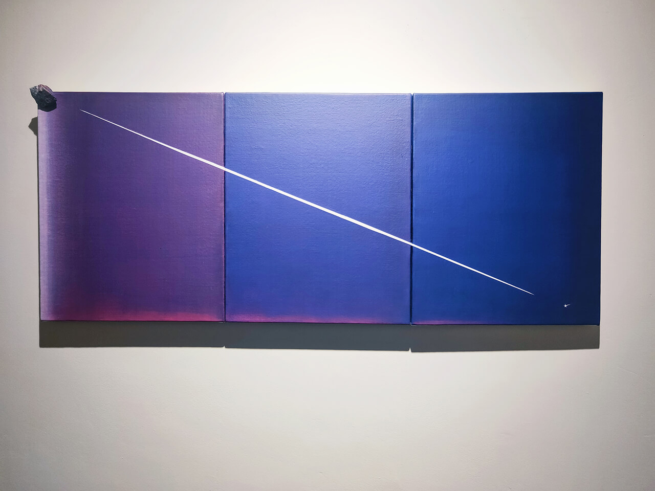 現場跟藝術家聊天後,才發現畫作色澤會因為光的不同而改變,若有去現場觀展,可以走近落地窗的作品觀察,有光的地方都有著不同的漸層色調,若是晚上看的話,金色顏料的部分也會更加突出,白天看或晚上看畫作的質感也會不同哦!