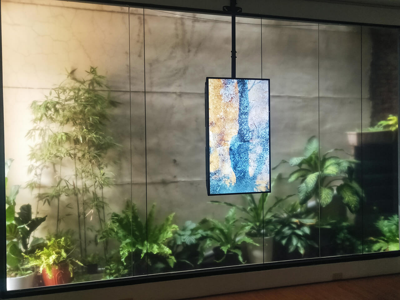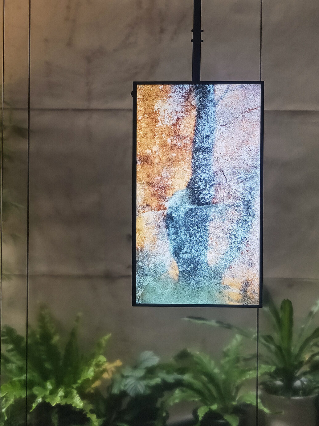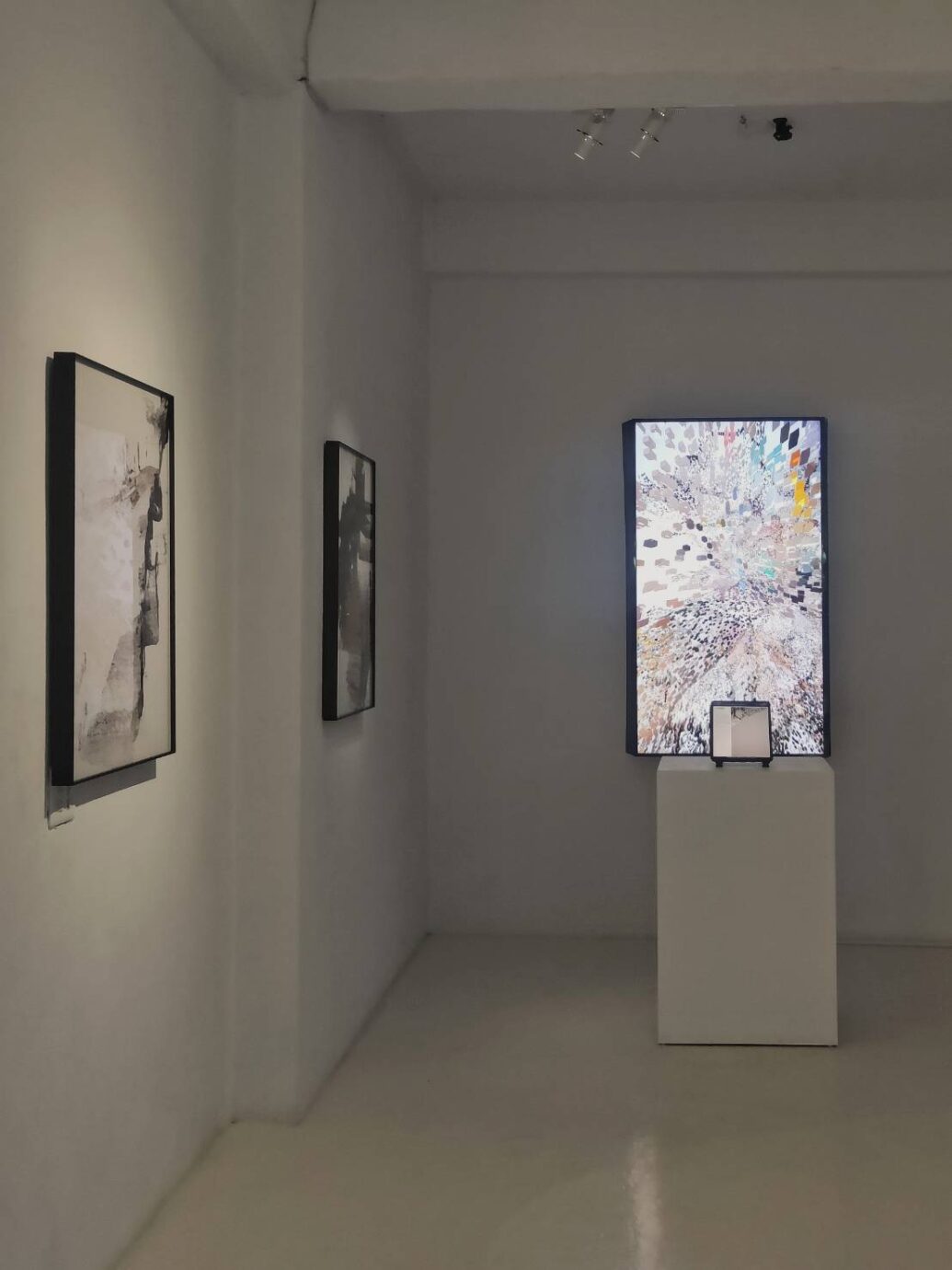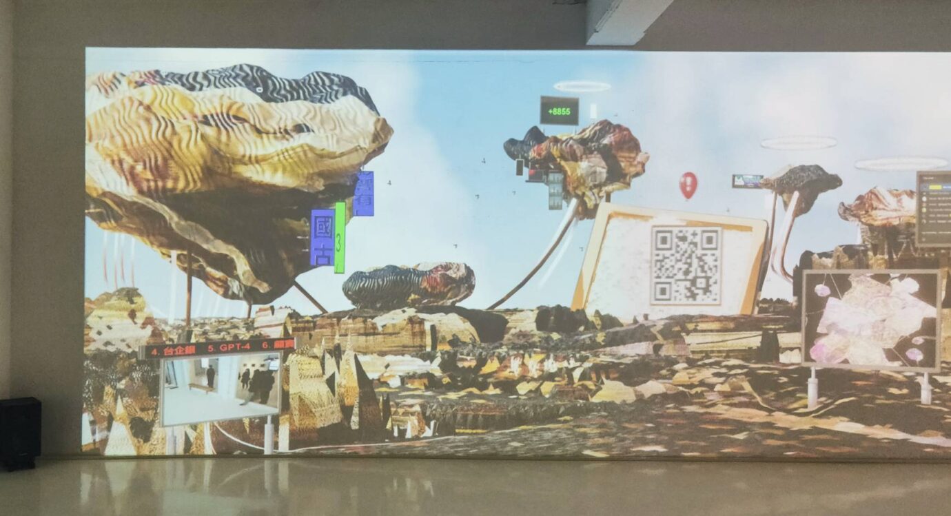 加力畫廊的作品是網路及虛擬世界的數位藝術,藝術團體貳進的作品《Data-Verse Taipei》,透過擷取網路世界的即時資訊、關鍵字及當下的數據搜集,匯聚且轉化為數位世界的土壤,在以錄像呈現的數位土壤上,你可以看到最即時的資訊、最有熱度的關鍵字以及最有討論度的話題!展場中還有一件數位萬年曆裝置,隨著即時產生的圖片、資訊,持續地延展時間與日期,是一件沒有時間終點的數位萬年曆~