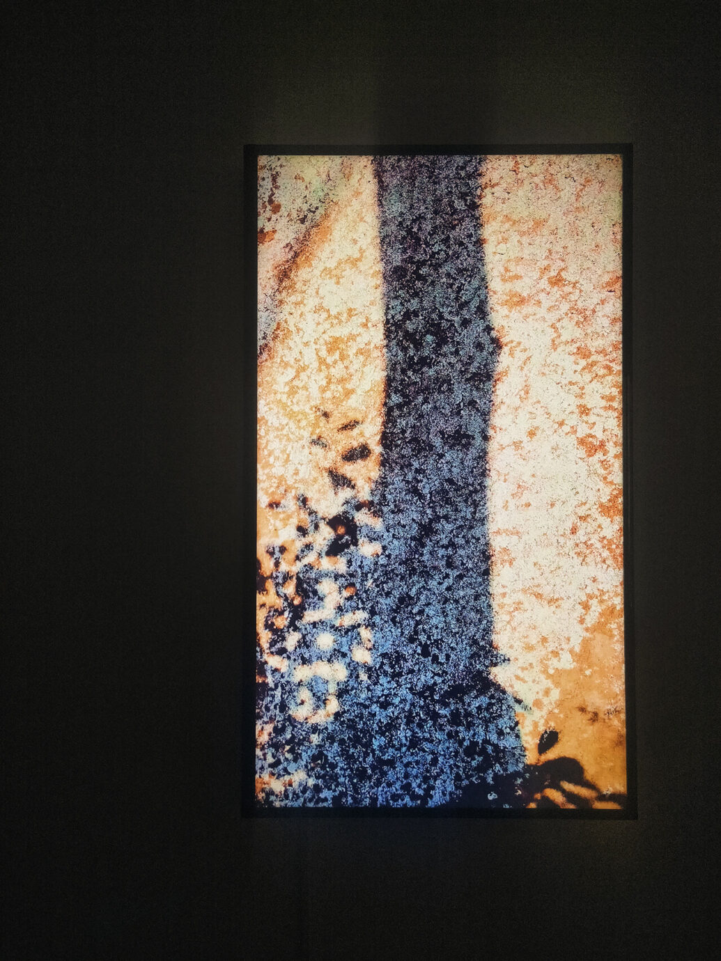 水色藝術空間的作品則是與光有關,展場一、二樓皆有作品,一樓昏暗的展間牆上放著藝術家平川祐樹的作品《Shawdow Play》,是光影之下的樹影,搖曳著樹影的背景不是地板,而是花岡岩的岩石。