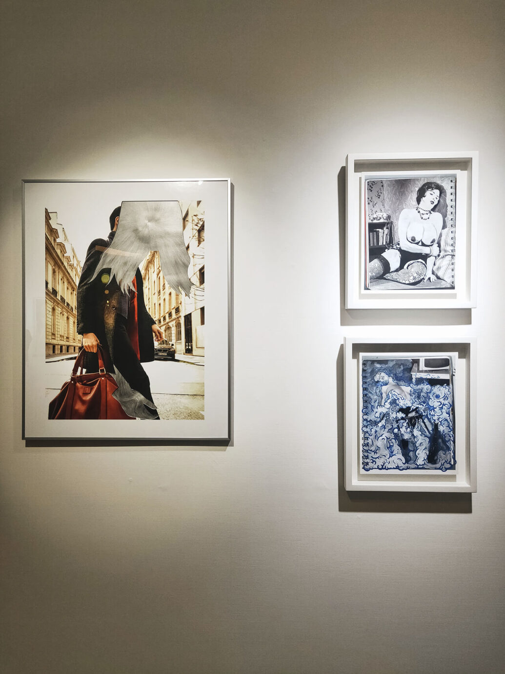 而另一側的作品則是藝術家曾怡馨的作品《親愛的古德曼小姐:波提卡女》,則是呈現著女性被觀看或男性慾望投射的視角,而被分割、拼湊而成的作品,則是沒辦法直接知曉性別的人像,異材質的拼貼、刺繡與繪畫,也讓作品有不同於一般肖像的異樣感。