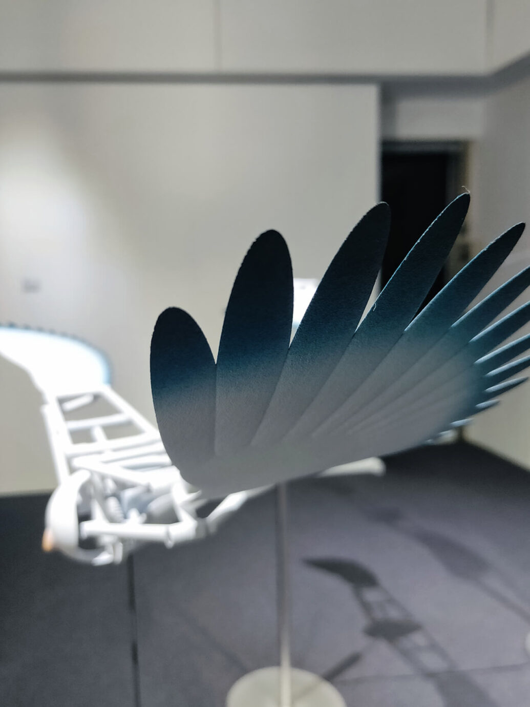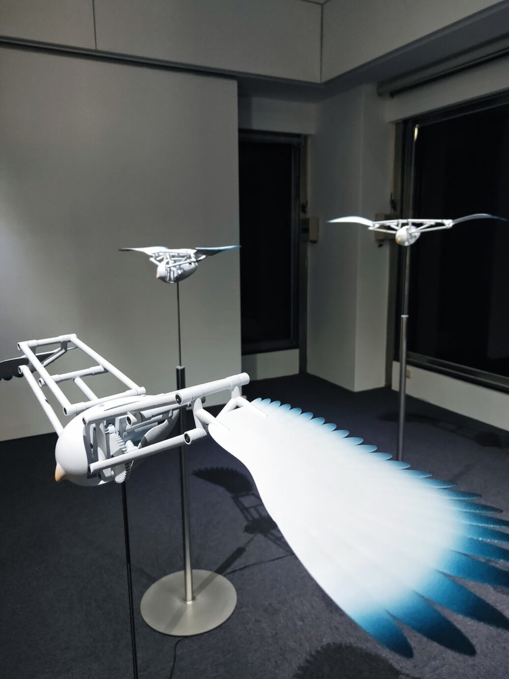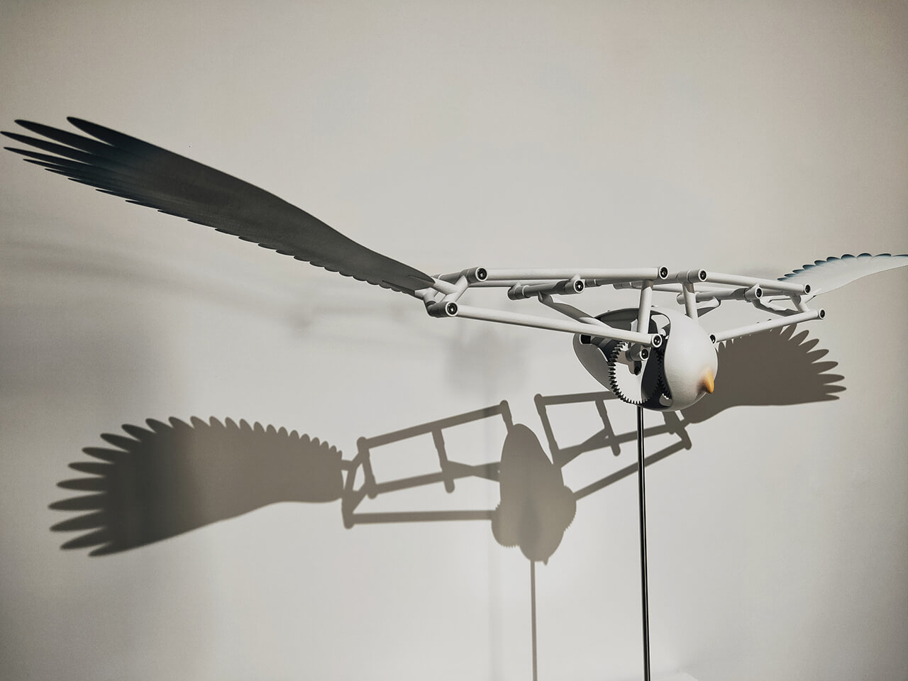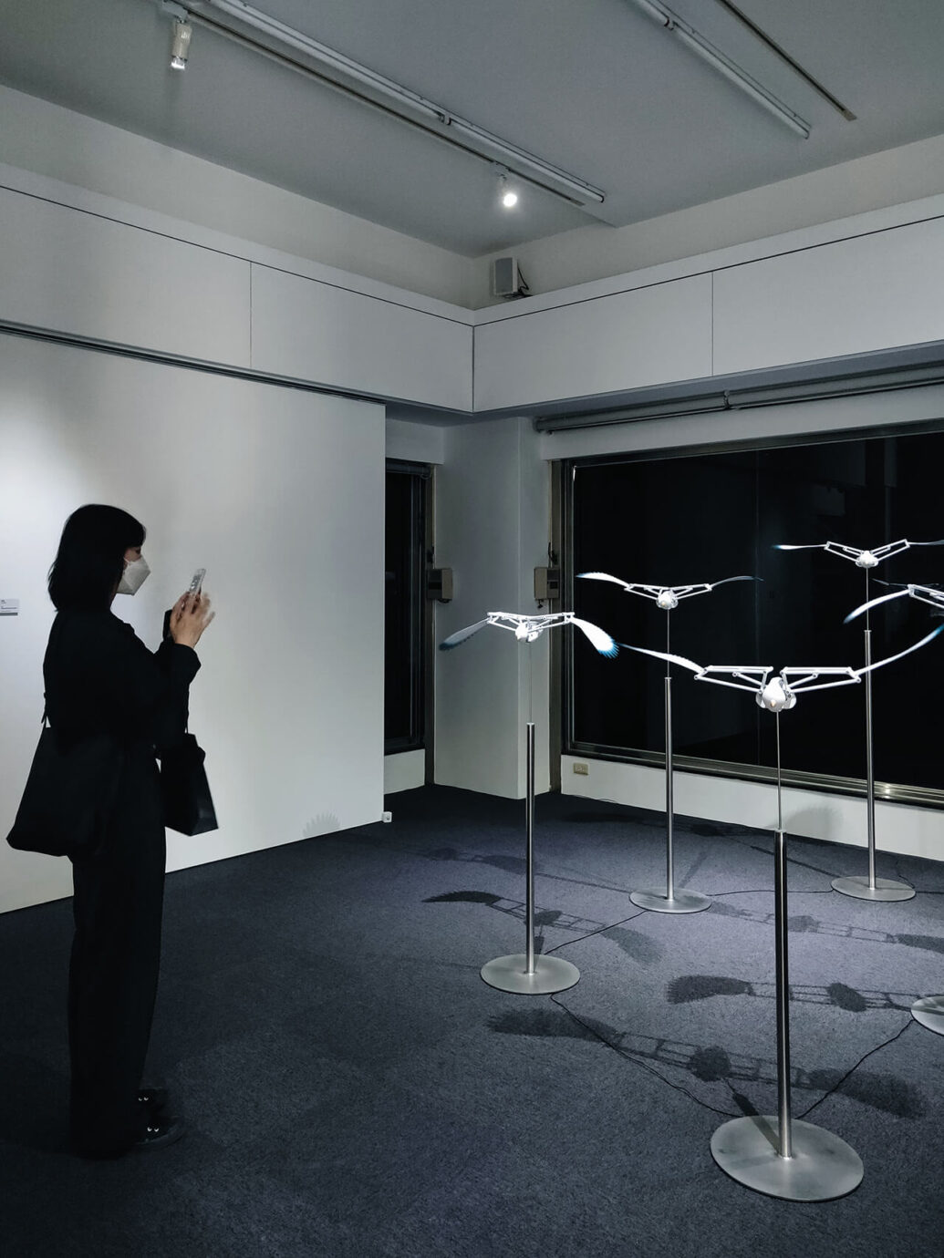 而藝術家盂施甫的作品《青鳥》是動力裝置創作,透過3D列印及齒輪等物件組裝,形塑一個個拍打飛翔的青鳥,也是另一種不同樣貌的動態雕塑。