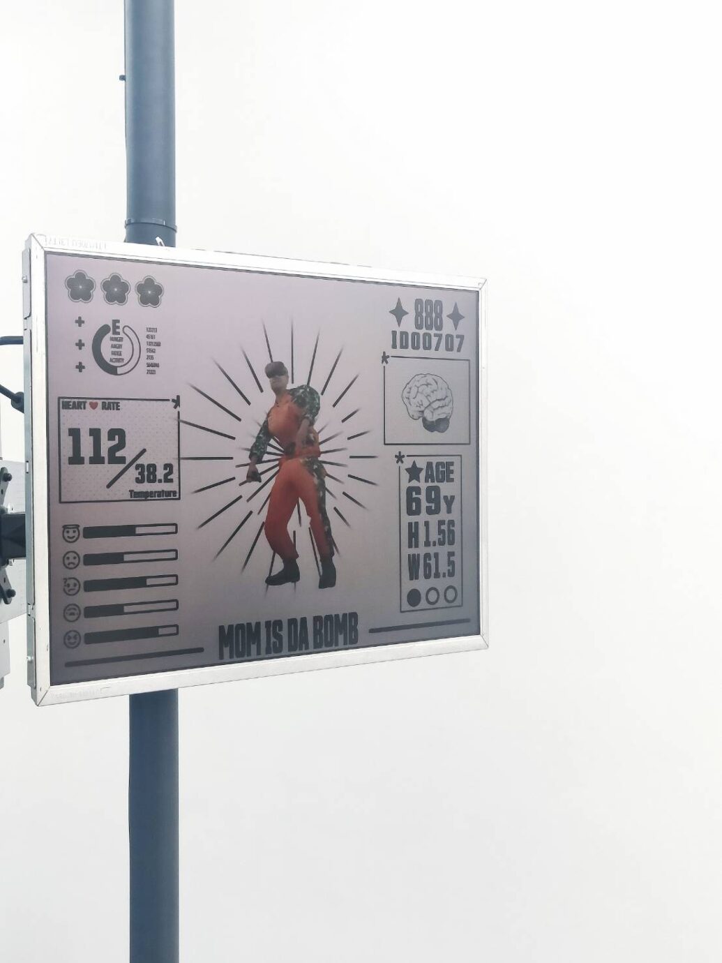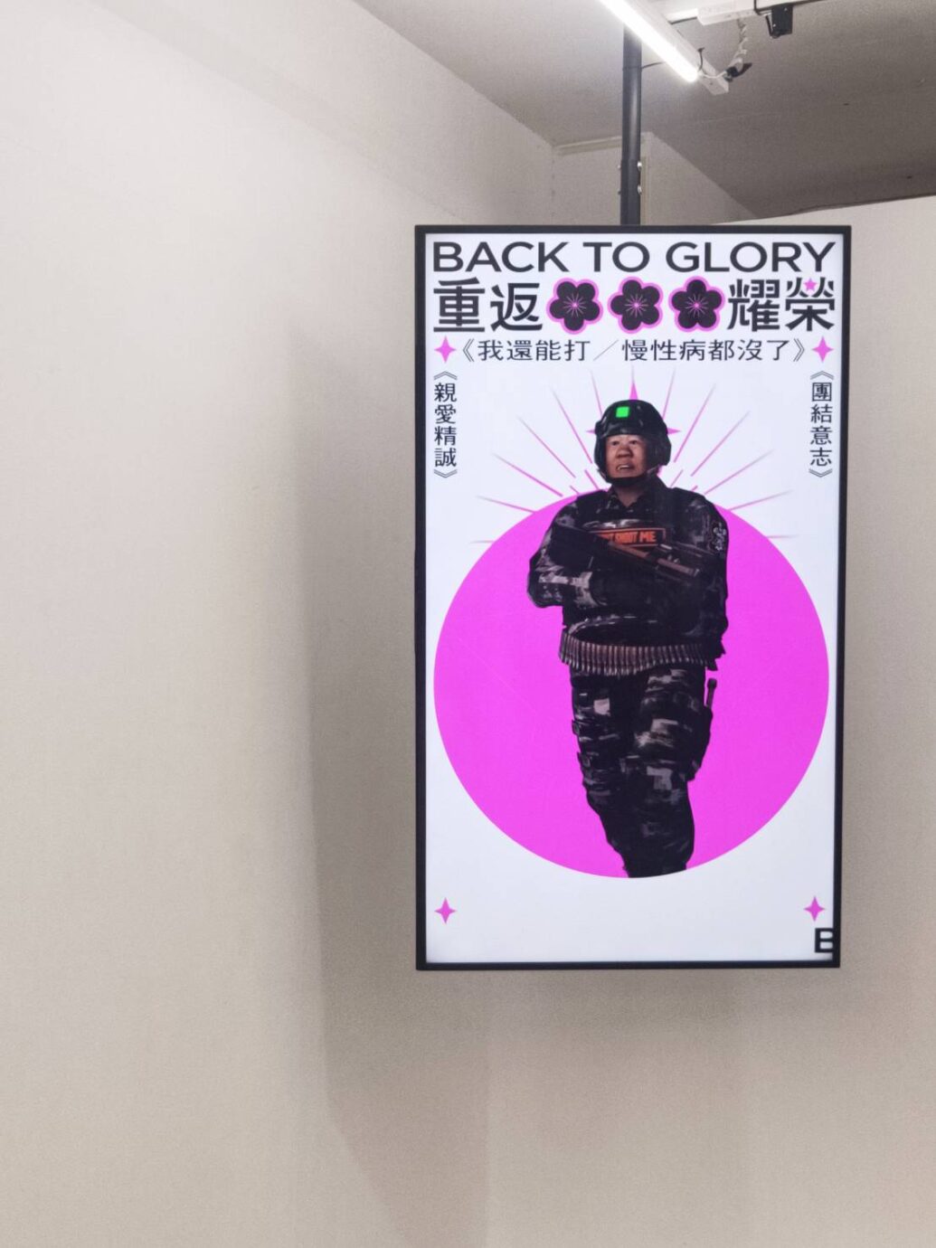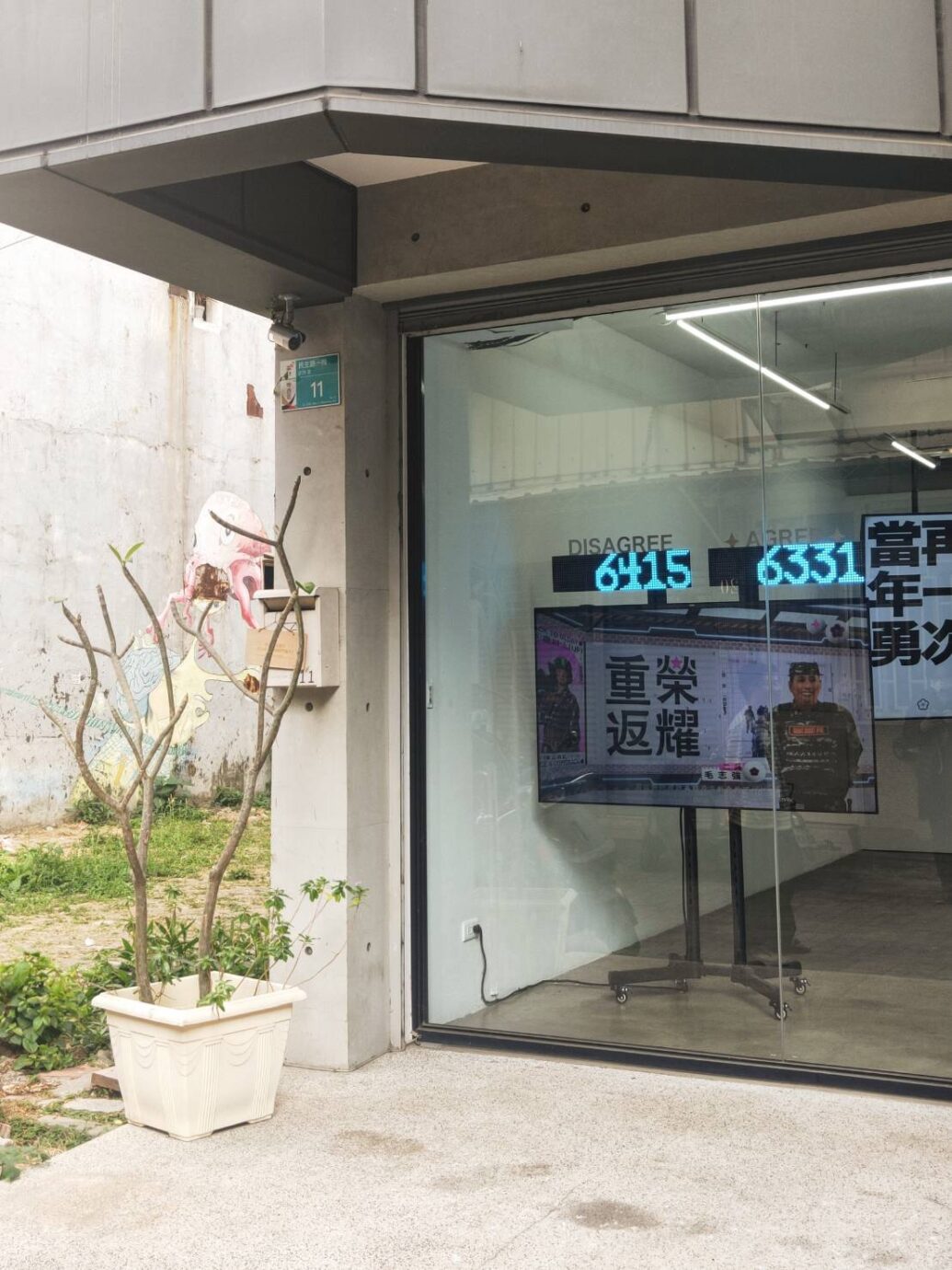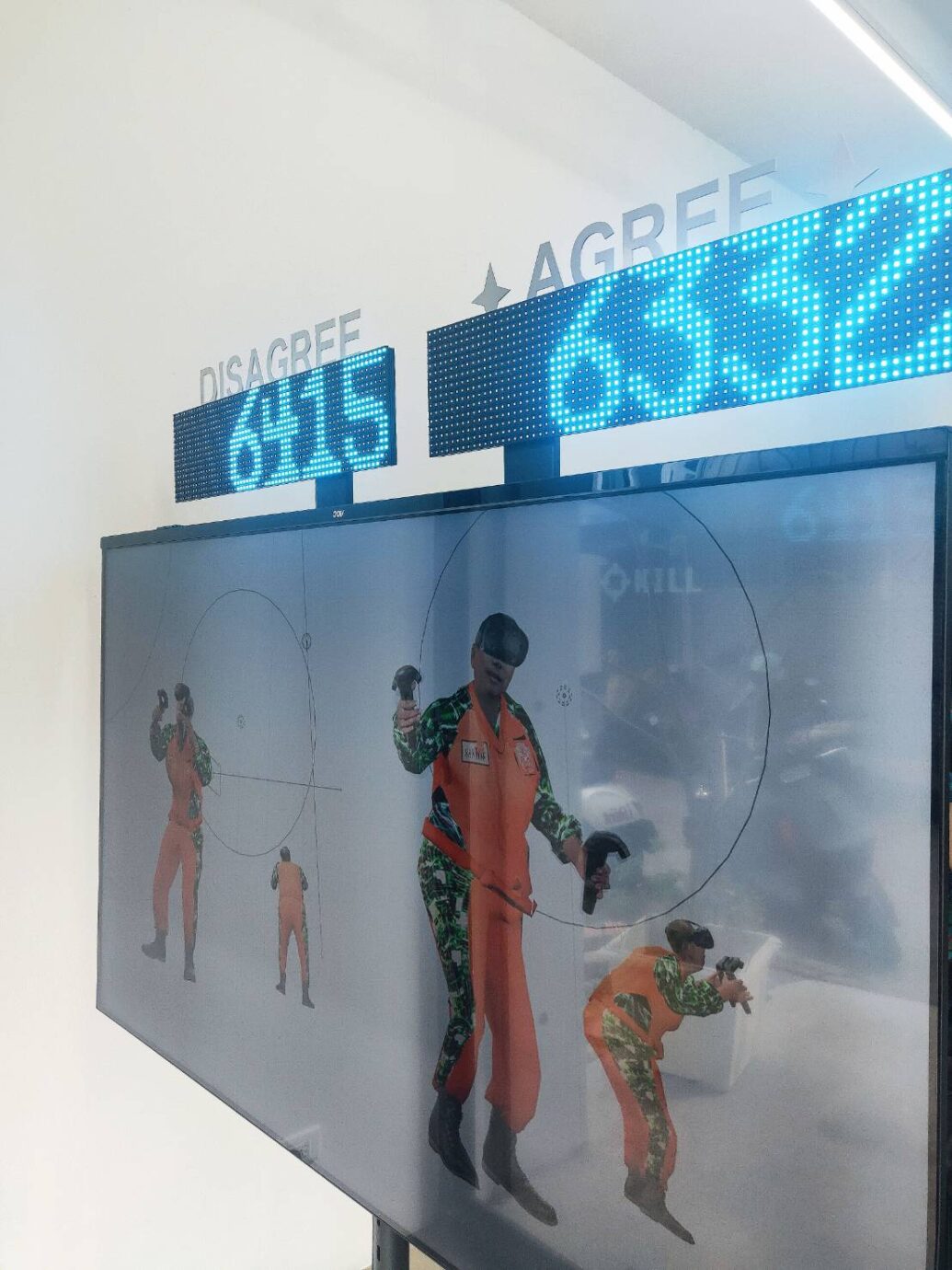 絕對空間是藝術家陳俊宇的作品《重返榮耀:讓__們再次偉大》,『為了更好的明天,你支持義務高齡化嗎?』透過寫實錄像與互動,讓觀眾透過投票的方式參與作品,政令式的宣傳廣告、詼諧的敘事與觀眾的參與,或許也會讓你對社會議題有不同的反思。