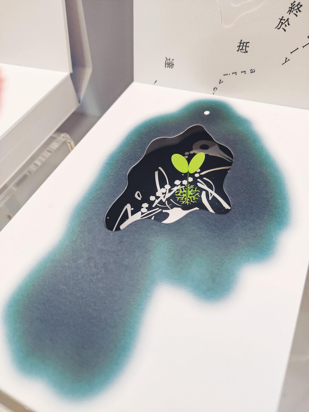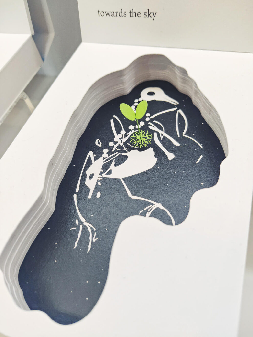 童里繪本洋行的微型展《鳥落地後》,是繪本創作者蘇維的新書展,一開始看到這場展覽時,女子馬上就被書籍精巧的設計、溫柔的主題抓住了目光,這是一本透過圖像來表達「死亡與新生」的繪本,作者以很短的篇幅、詩集般的圖像,讓人在短短的閱讀時間內,感受到生命的死亡過程與新生命重新破土的餘韻。