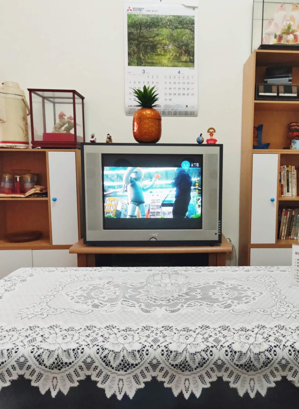 ・《戰鬥之城》於雙年展的展示時,創造了如家中客廳的空間,觀眾可以坐在沙發上,像是在家中看電視般,觀看錄像作品的影片。