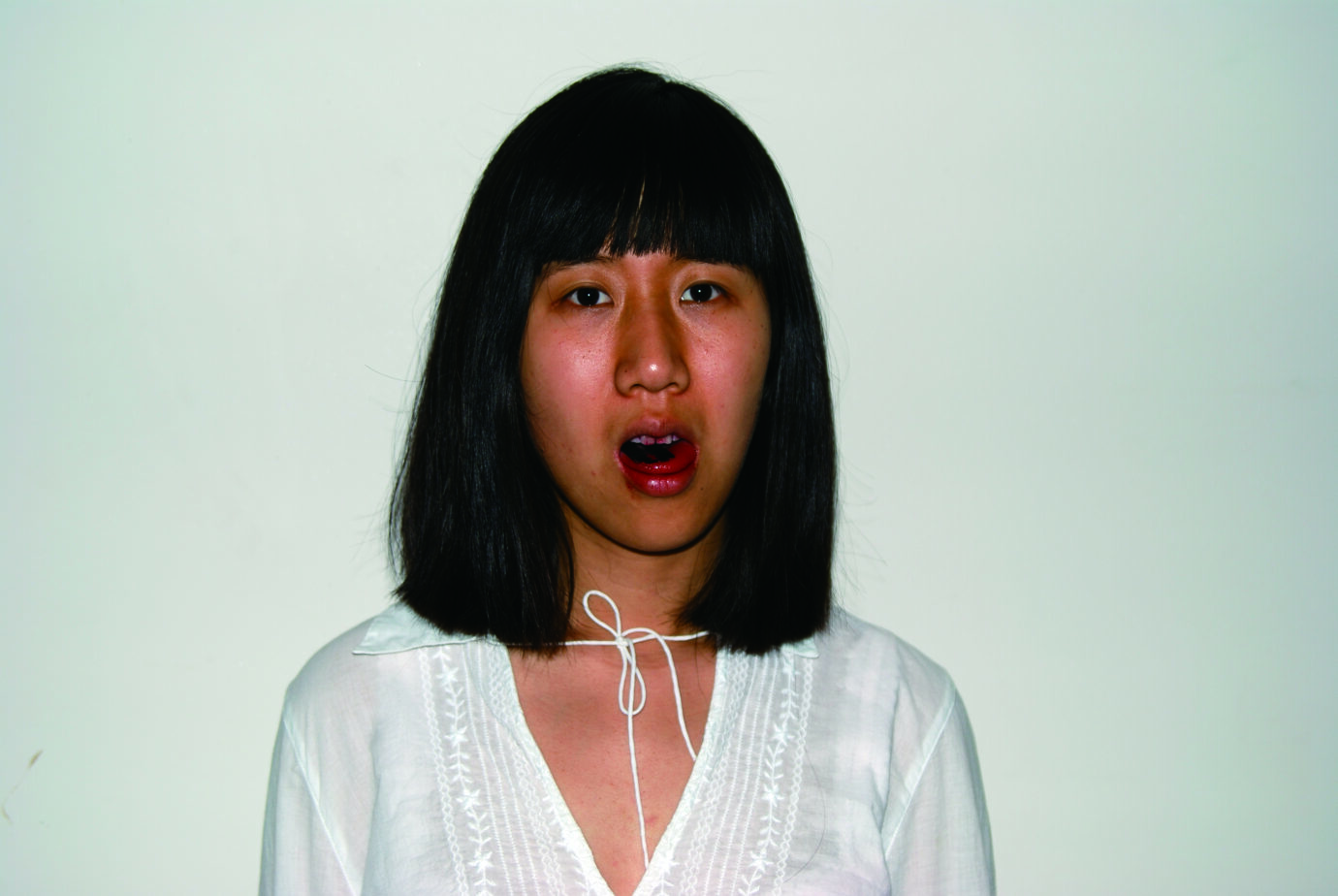 由於在看錄像之前,看介紹時就知道藝術家是含著刀片在說話,比起述說的內容,女子發現我會更加在意在說話過程中的表情,試圖從表情上讀出每一個感受到疼痛的瞬間。