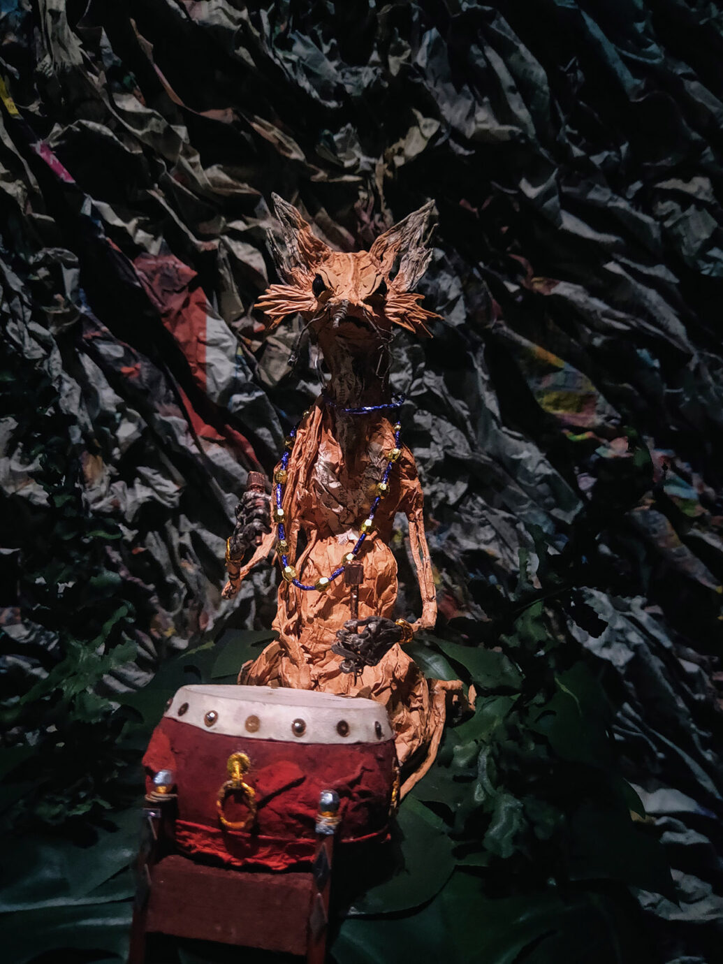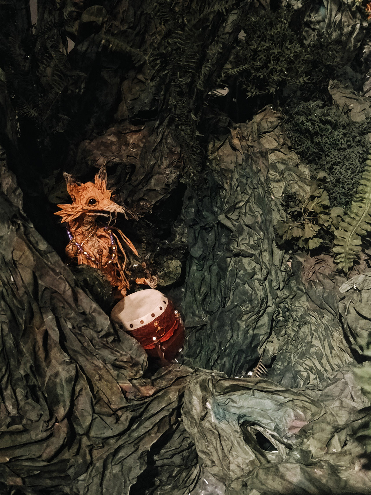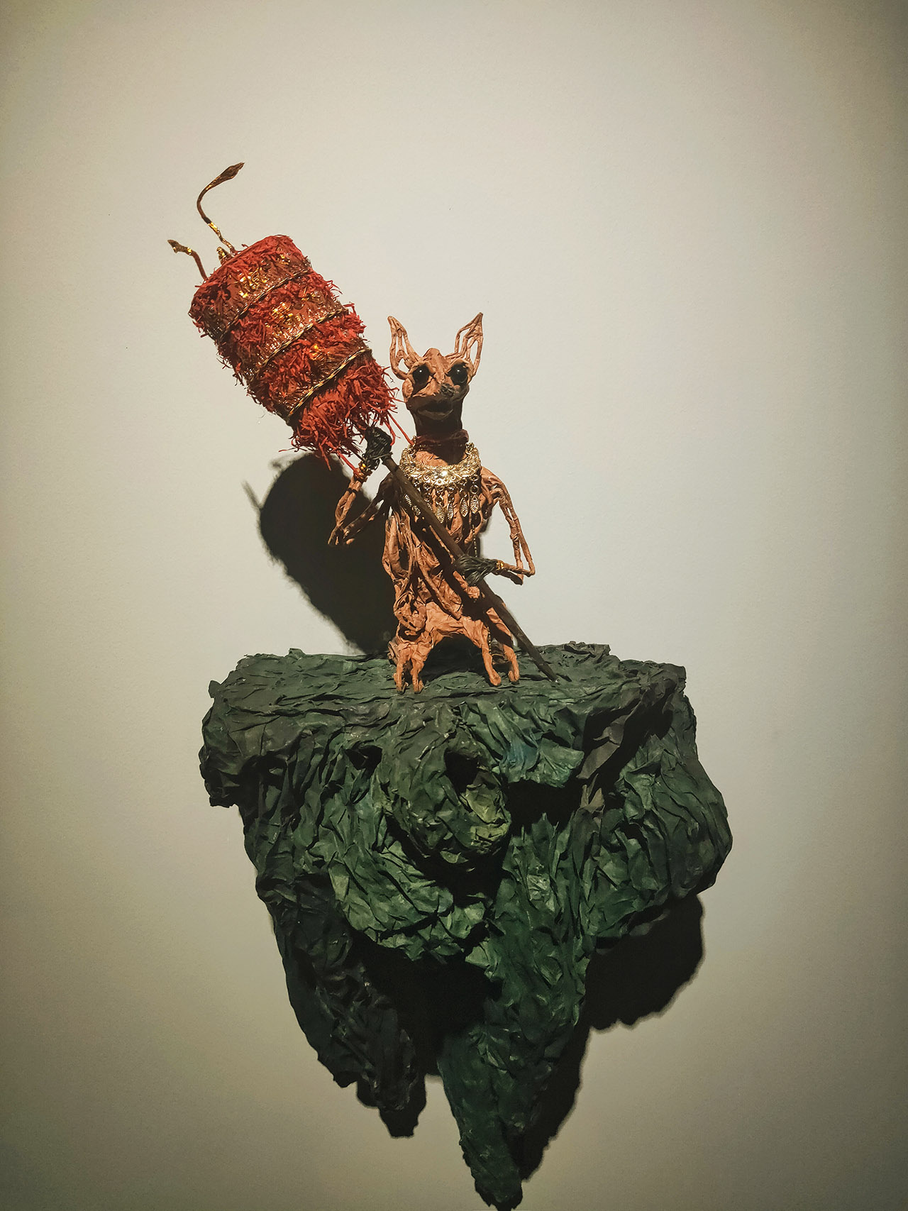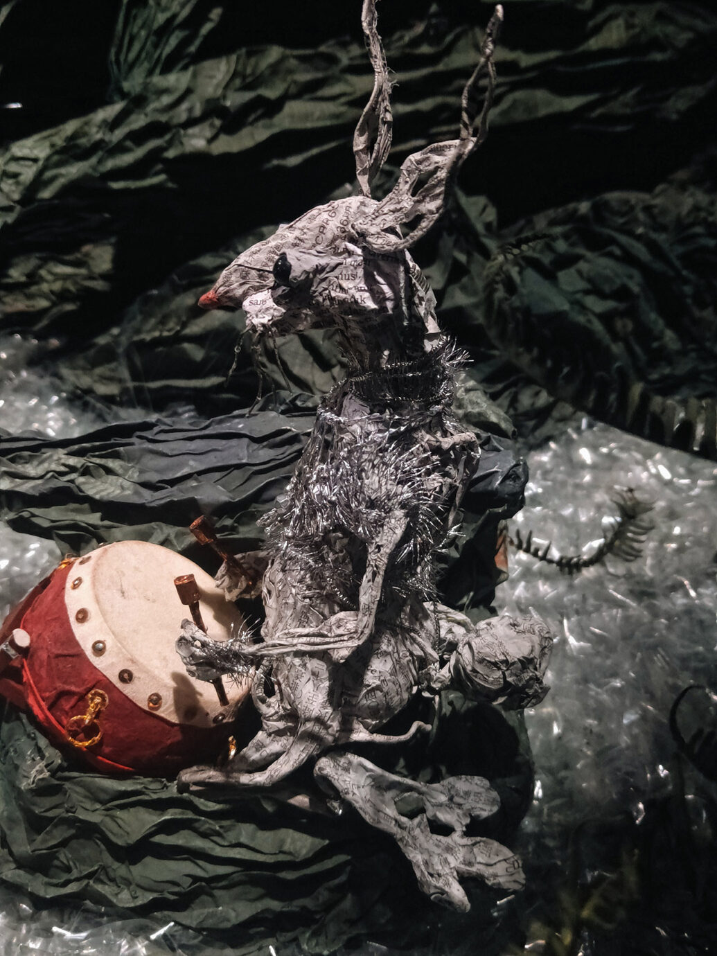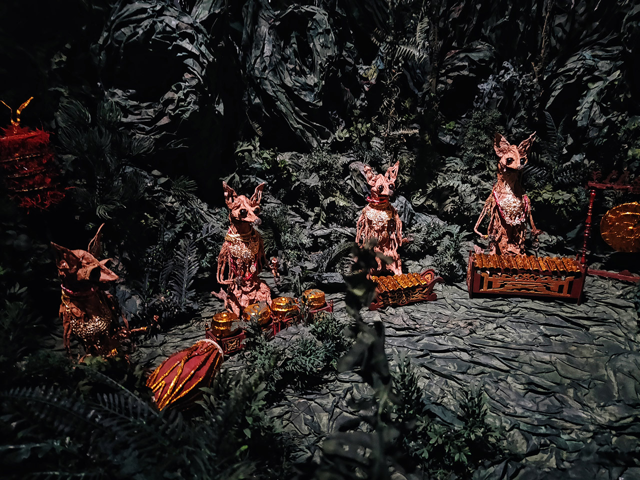 現場觀展時,我前後繞了3次展場,看了2遍錄像,看過主要的故事後再看展品感受特別不一樣,過程中也發現紙偶動物們的姿態是有差異的。即便同樣都是老鼠,在錄像中打鬥的老鼠,毛皮之下都有一張紙紮人偶的人臉,身形也更像人。