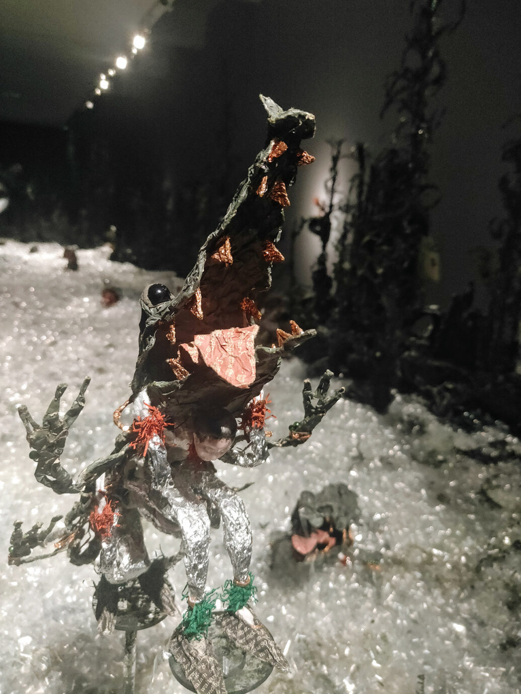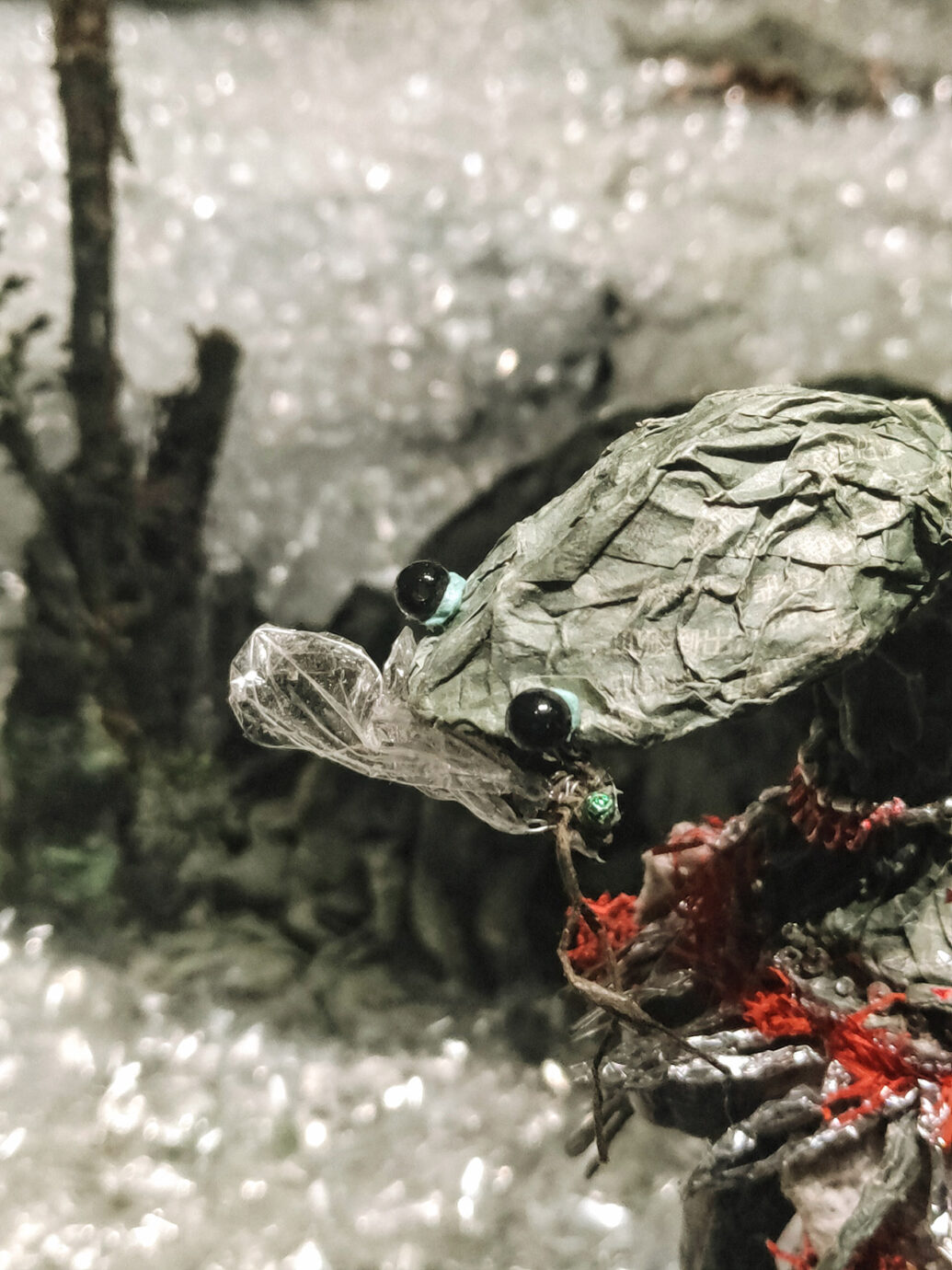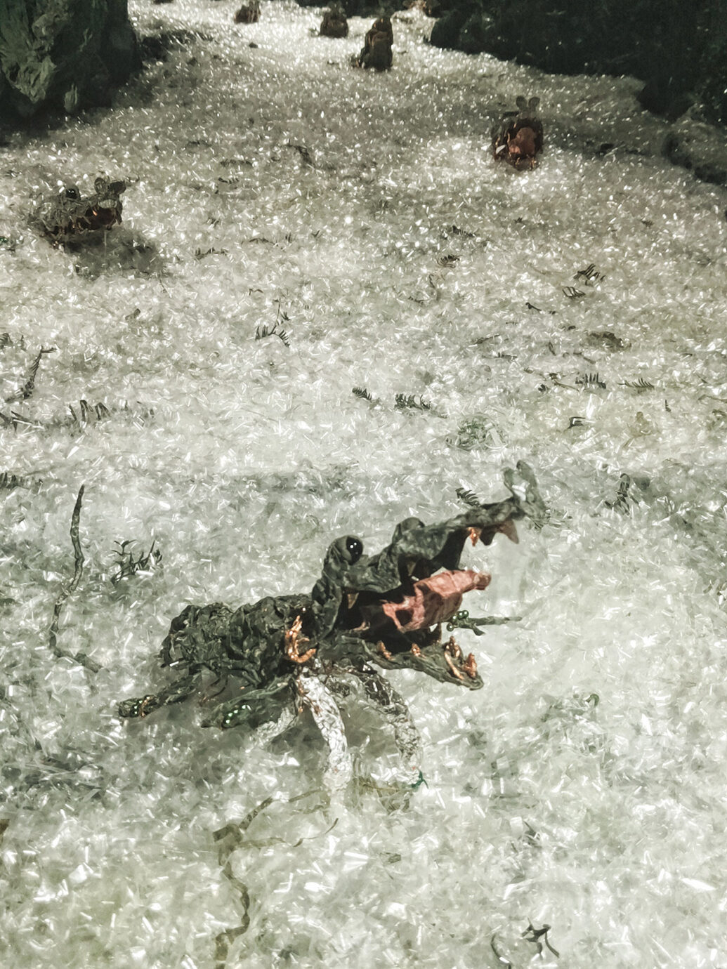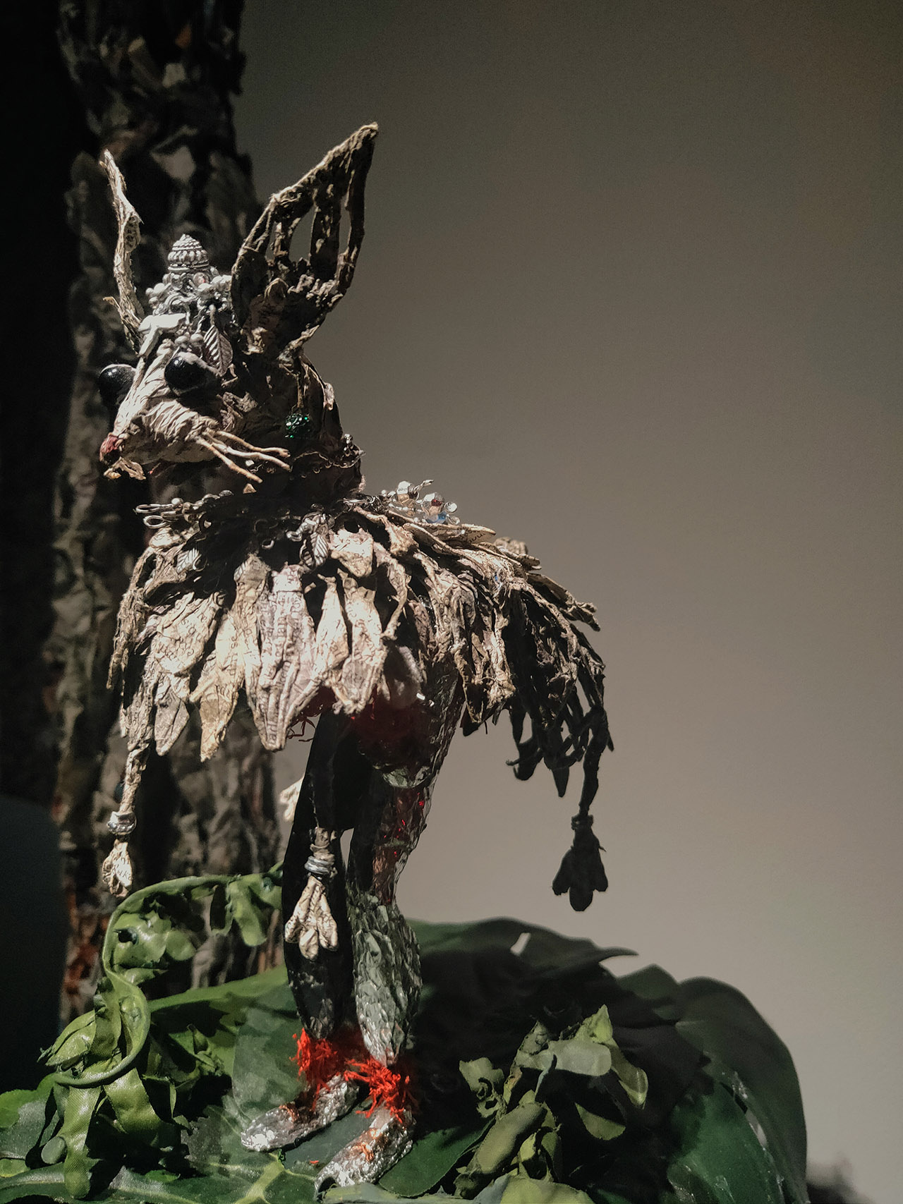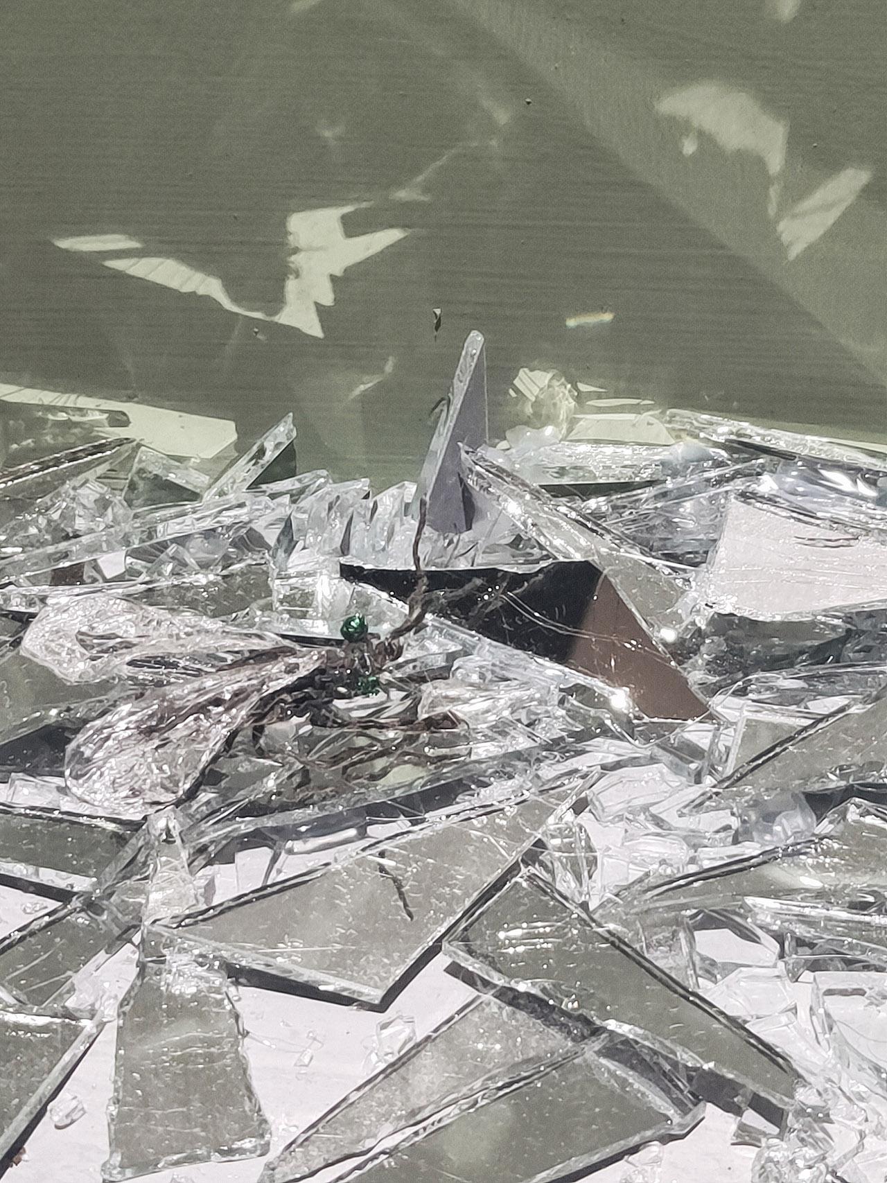 另外頻繁出現於展場中的鏡子與碎片也讓人難以忽視,包含過往的看展經驗在內,不管是之前展出的紙紮老鼠與壁虎,我一直覺得藝術家在鏡子的運用上很像一種生死的夾縫。
