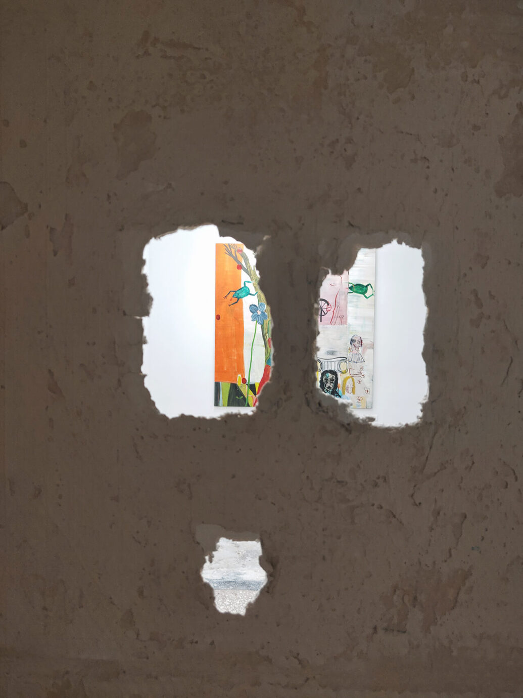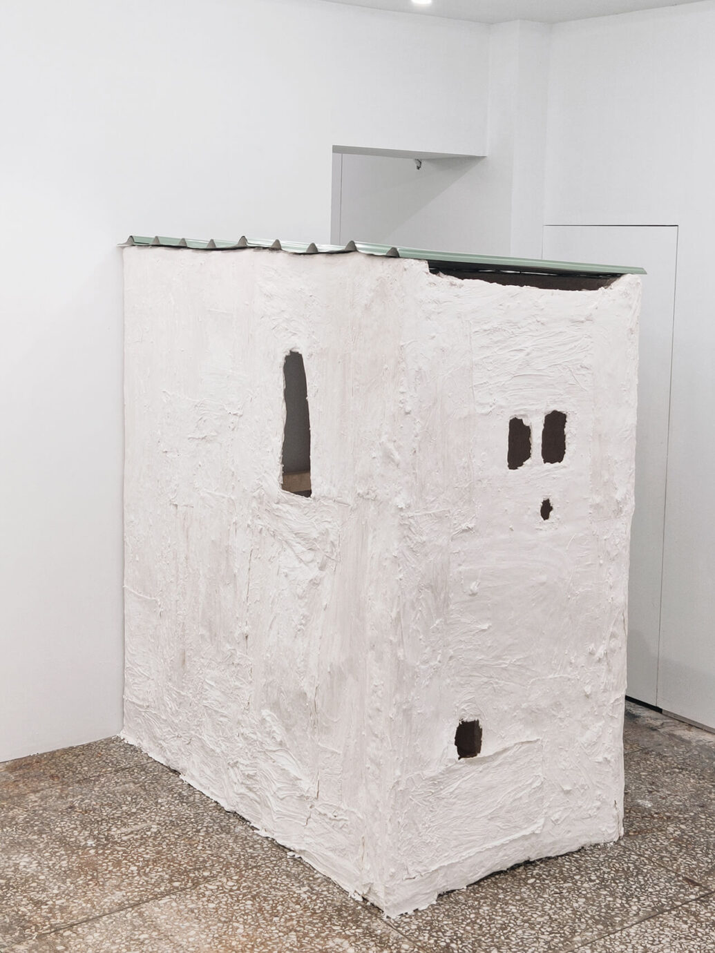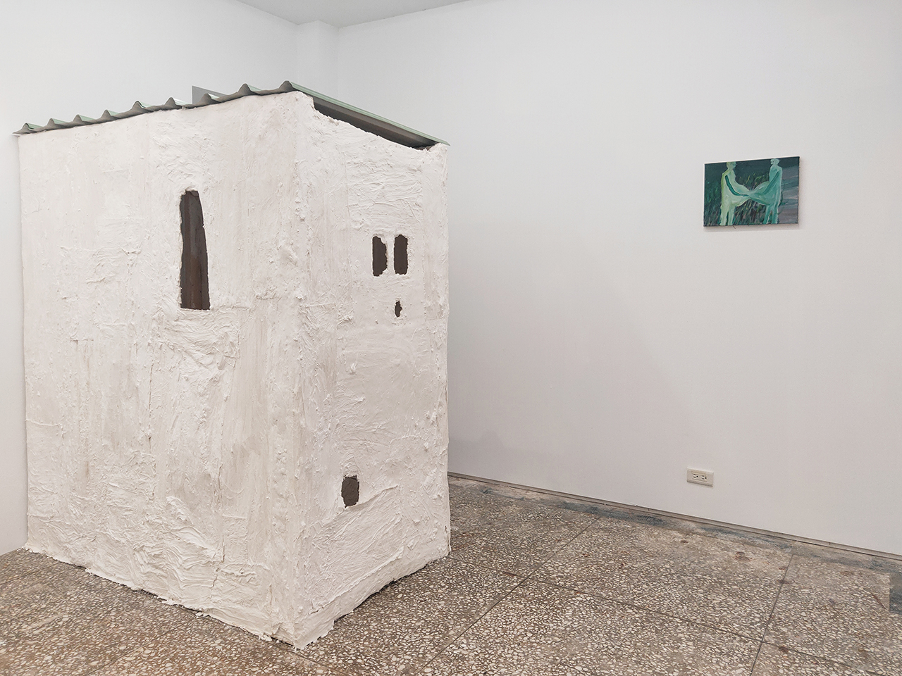 藝術家將畫中的房子延伸至展場,以簡單的媒材在展場中蓋了兩座小巧的房子,你可以實際走進房子裡又或是透過房子上的孔洞窺探畫作,房子的屋頂甚至是台灣人都很熟悉的鐵皮屋頂呢!(讓人覺得很有親切感XD)