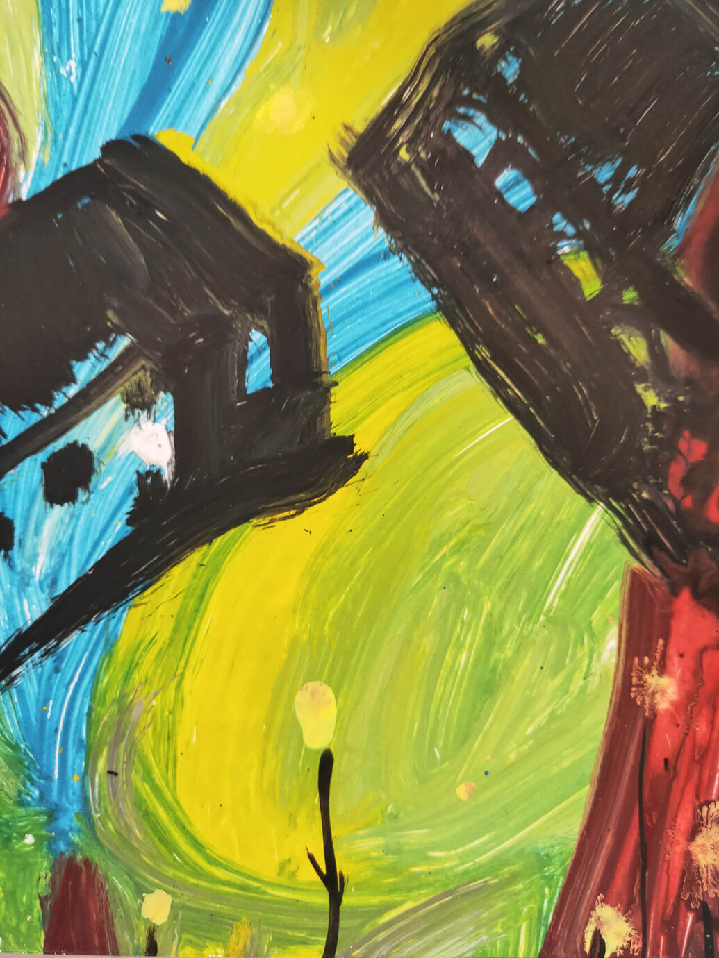 在不同的畫作中也可以看到一些相似的元素反覆出現,首先留意到的就是畫面裡形色各異的小房子,有的是線條、有的是色塊、有的則是拼貼等,這些小房子也不只存在於平面畫布上,同時也延伸至實體的展場空間!
