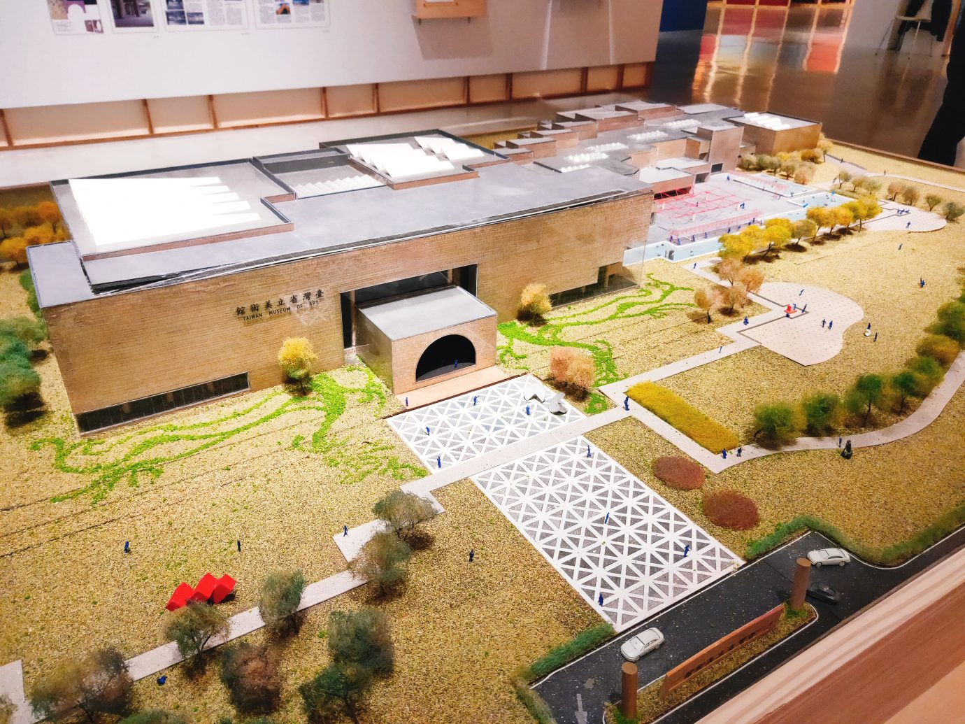 當國美館以前還是「台灣省立美術館」的時候,大門還是有使用的,可以從建築模型看到明顯的圓拱形大門,後來變成國立美術館的時候,整體規劃及動線改變,就遮蓋了原先的大門,透過兩種新舊建築模型的比較,就可以看出差異哦!