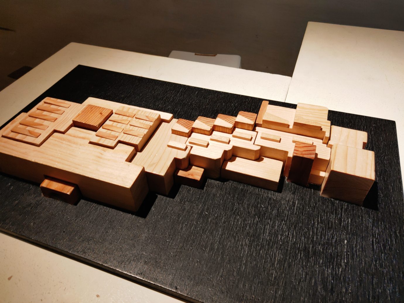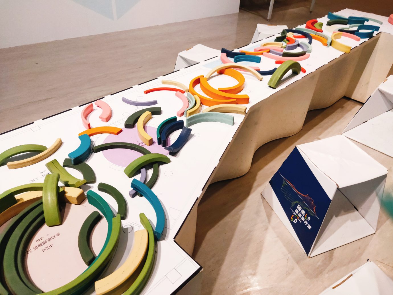 另外展覽中還有一個互動的空間,看完正統的建築模型後,也可以自己手動拼看看!空間的桌子上有國美館建築的木頭積木,還有未來兒童教育空間的積木,讓觀眾都可以嘗試去拼湊建築的樣貌。