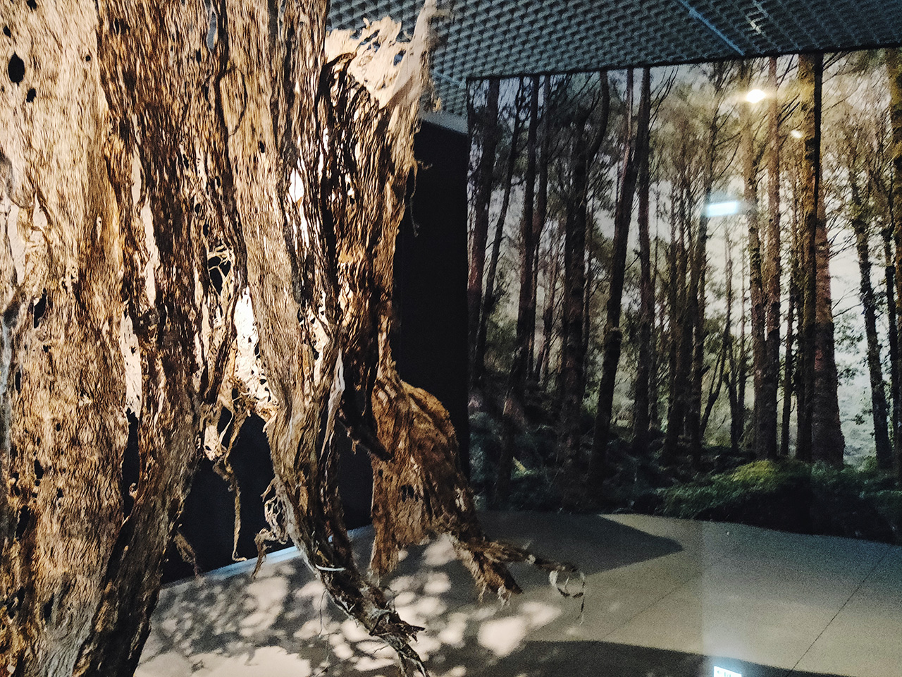 以長時間的觀展經驗來看,應該是一種藝術家的虛構敘事(至少裝置應該不是真的,因為現場沒有樹木,但仍然持續電燒著文字)