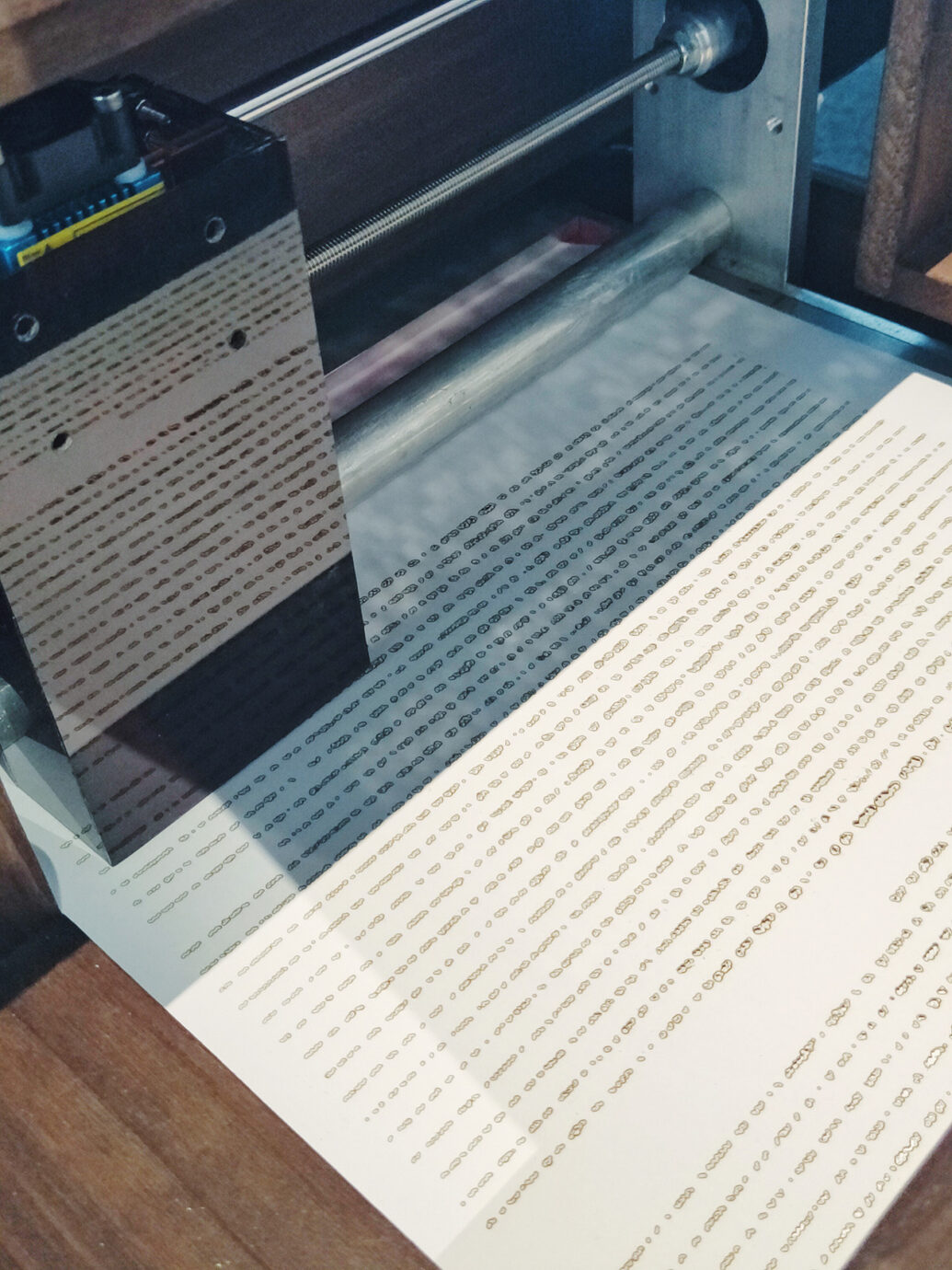 另一件喜歡的作品,則是三樓的《高橋先生的筆記本》,這件作品是透過一種「思想傾聽器」來感知樹木震動,並轉化為人們不可辨別的電燒文字。