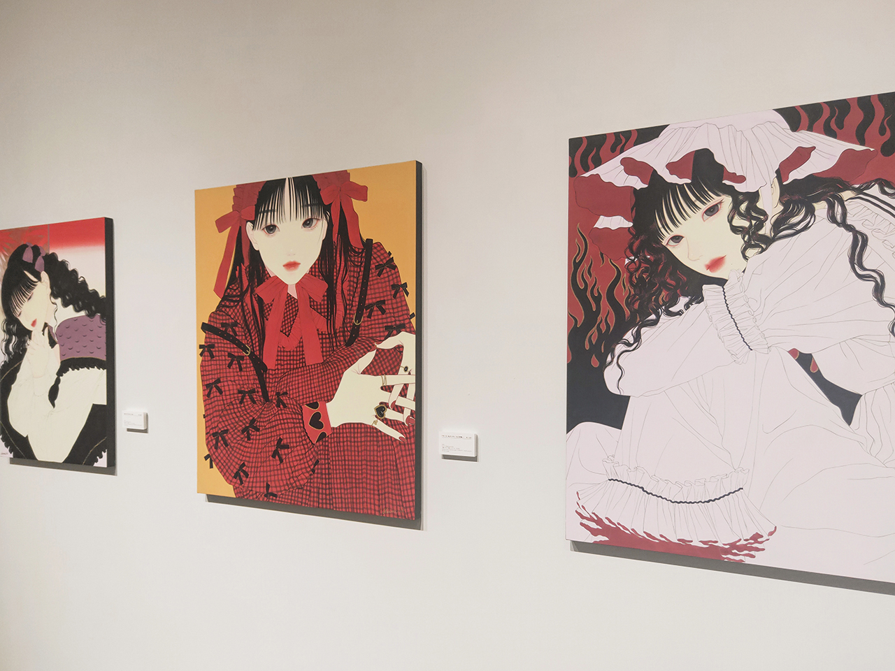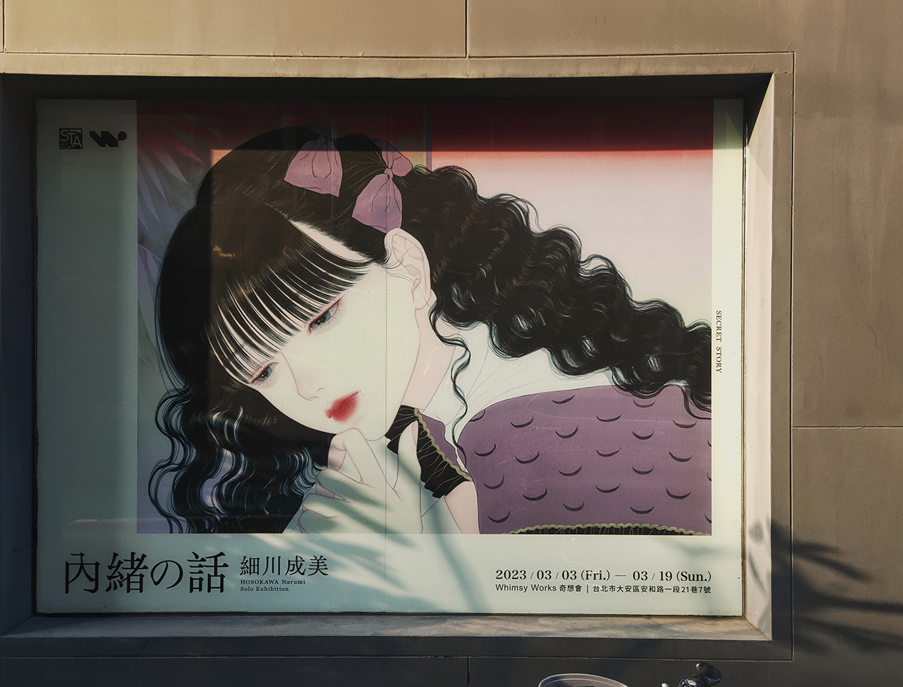 奇想會 Whimsy Works Gallery 的當期展覽《內緒の話》是細川成美首次在台灣展出的台北展覽,以日系油彩與80年代的漫畫風格,繪製了許多不同的少女姿態,他所繪的少女大部分皆是白皮膚、黑髮及紅唇,除了精緻的面容以外,仔細看也會看到許多筆觸上的細節,而少女身上的蝴蝶結與絲帶也是在畫中能經常看到的配飾哦!