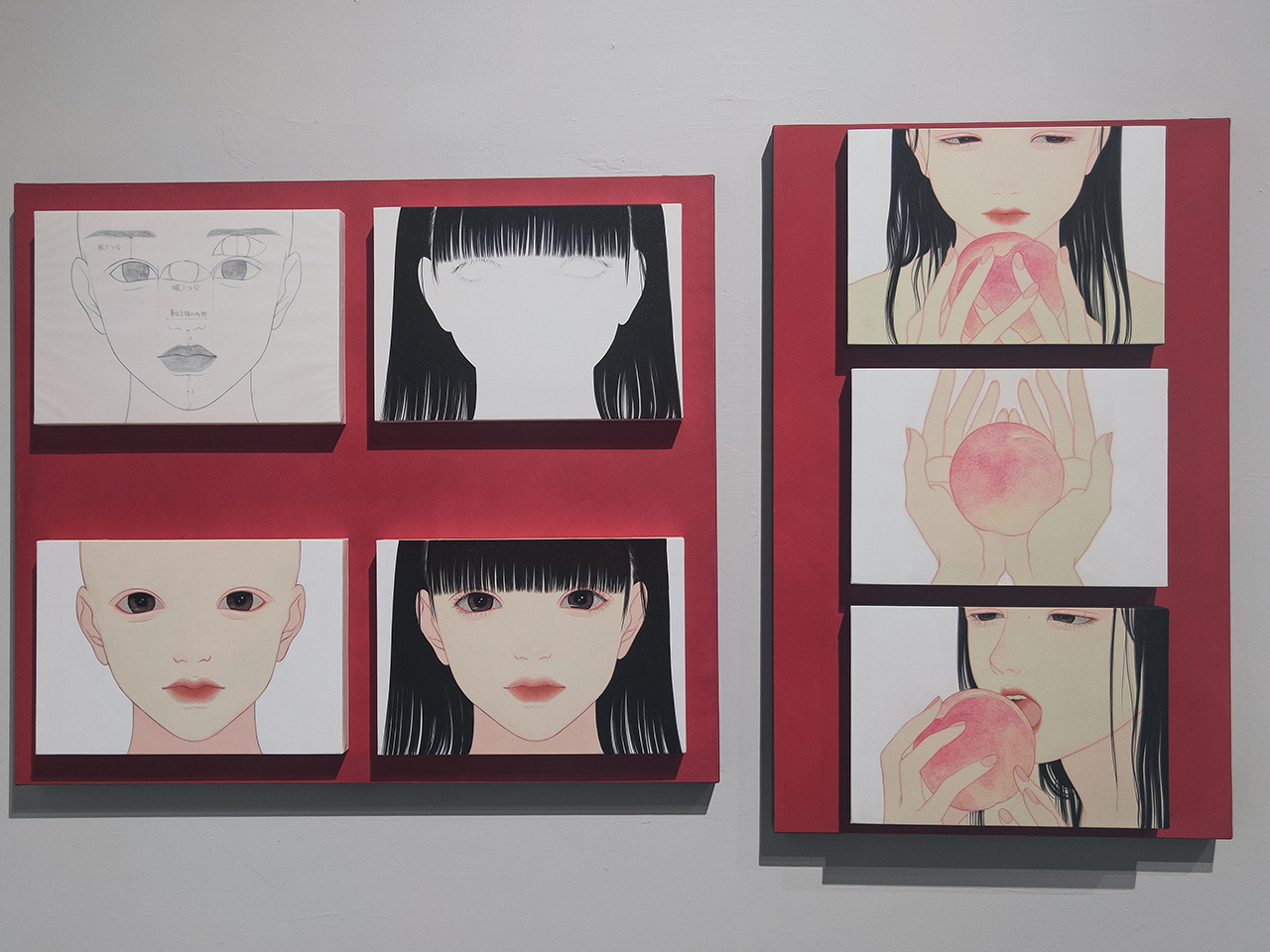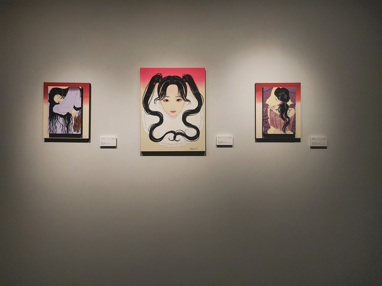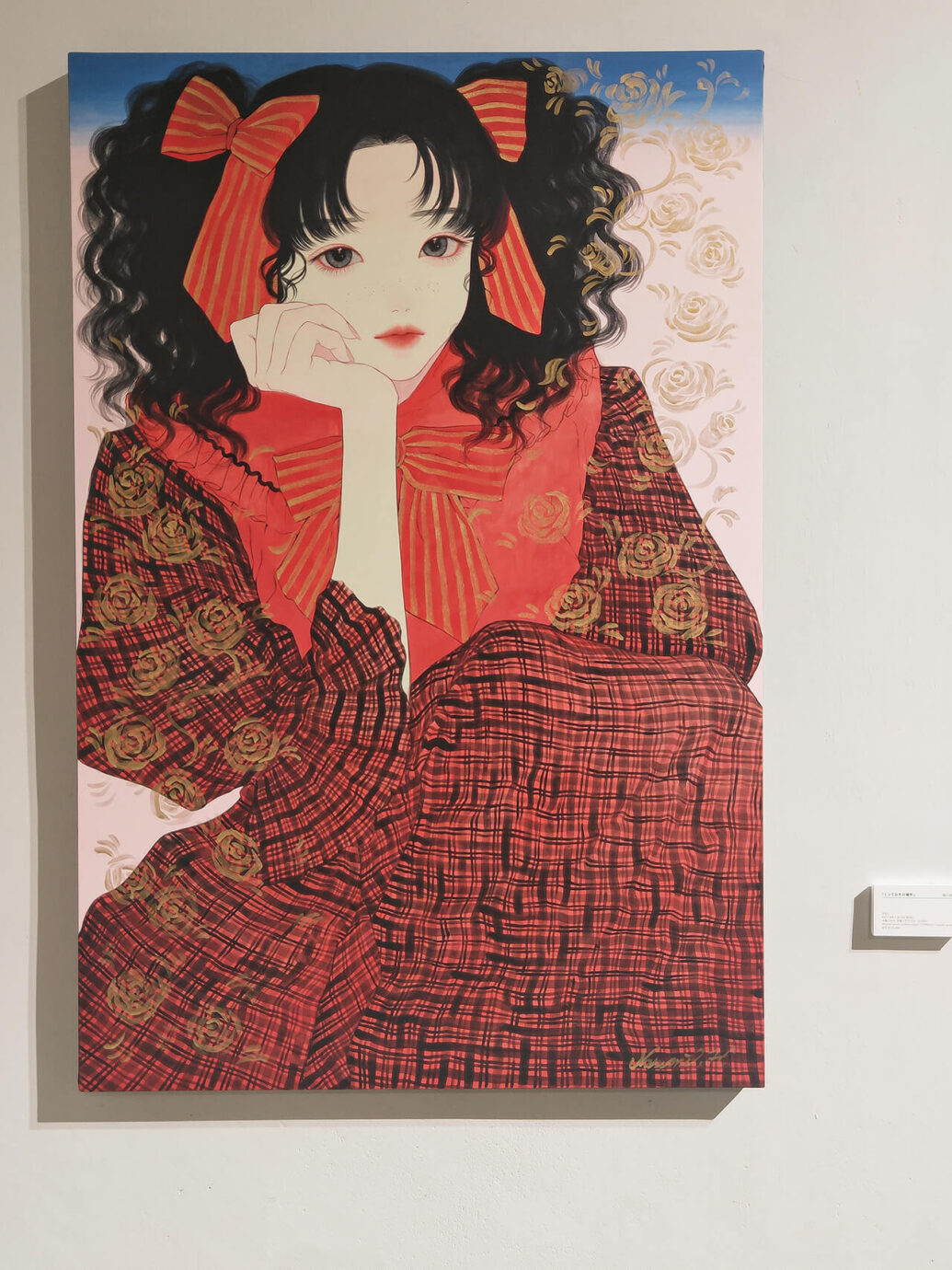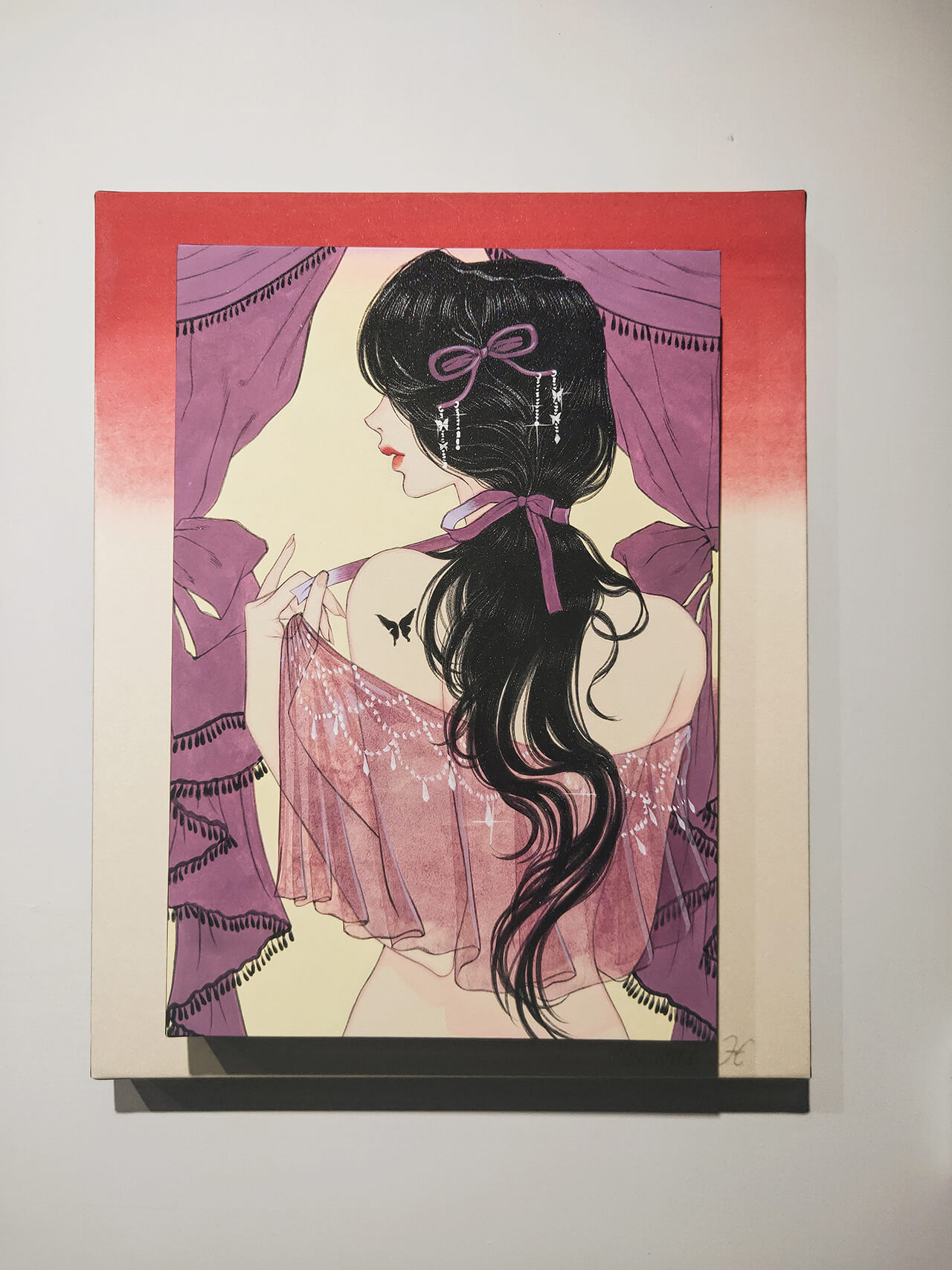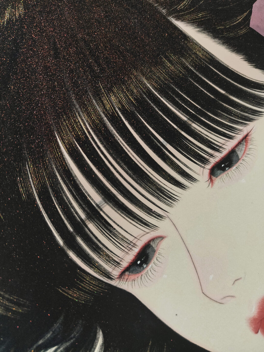 現場觀展時,最讓人感到驚喜的便是媒材與畫作的細節,和紙暈染的淡雅色澤、烏黑髮絲上閃爍著細碎的光芒,甚至不同樣貌的少女,髮絲筆觸的基礎色調也會不同(有的是紅色,有的則是綠色)