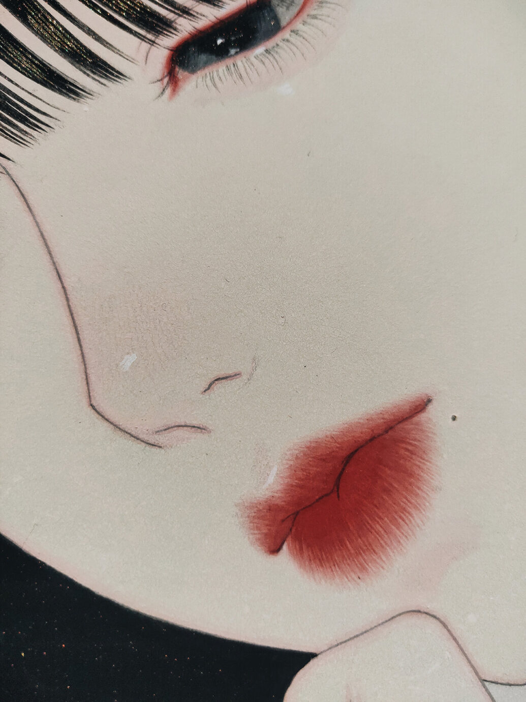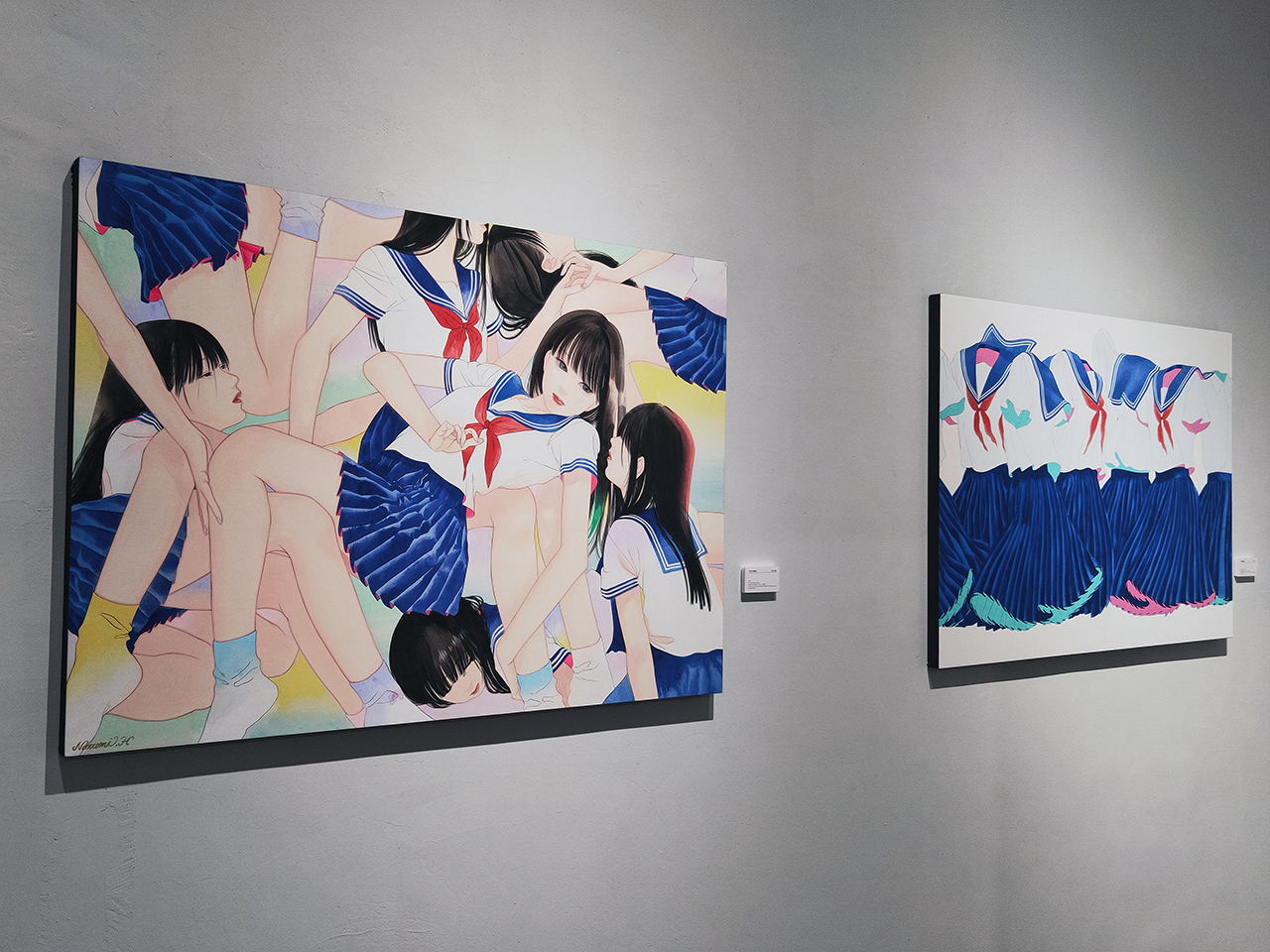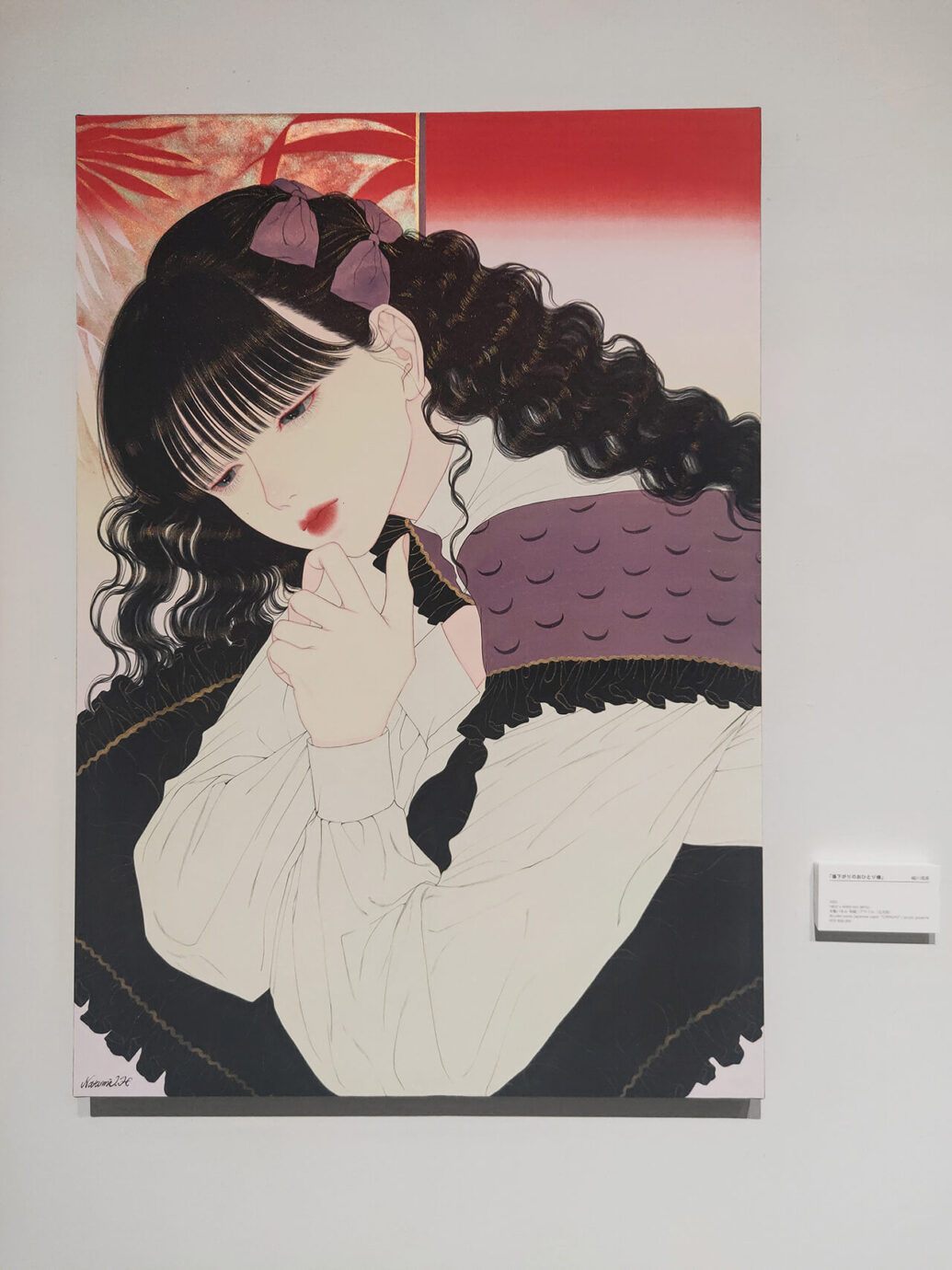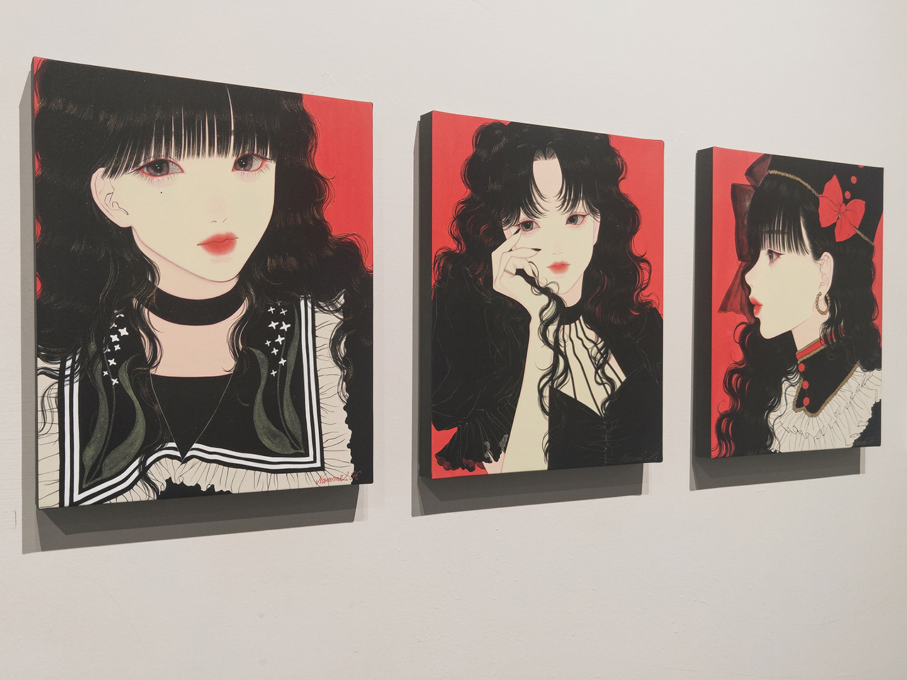 現場觀展時,最讓人感到驚喜的便是媒材與畫作的細節,和紙暈染的淡雅色澤、烏黑髮絲上閃爍著細碎的光芒,甚至不同樣貌的少女,髮絲筆觸的基礎色調也會不同(有的是紅色,有的則是綠色)