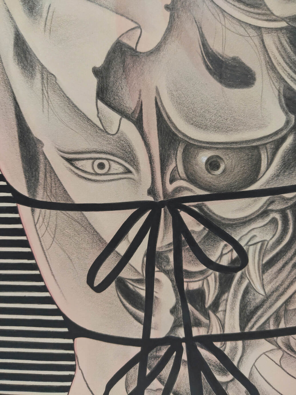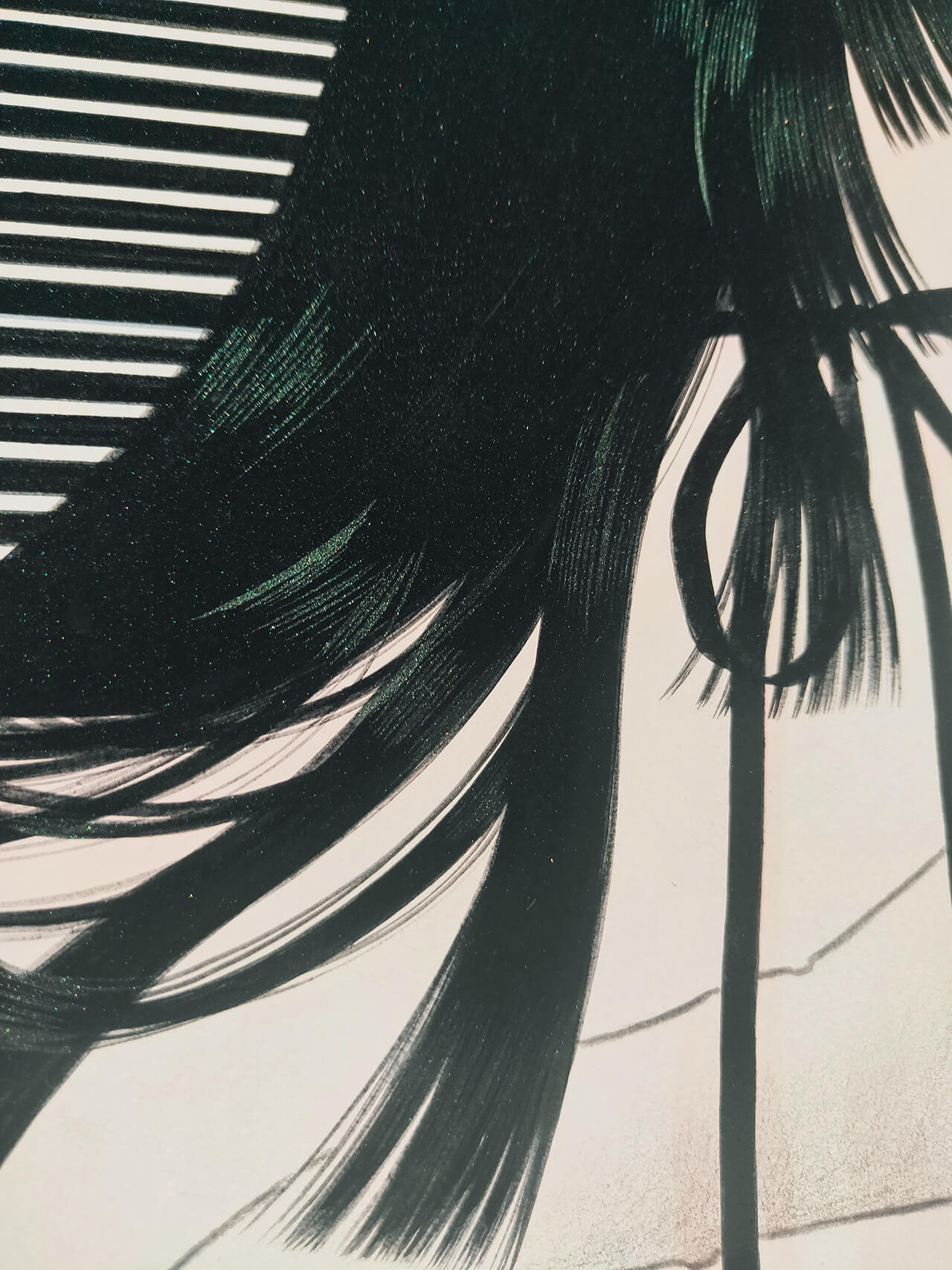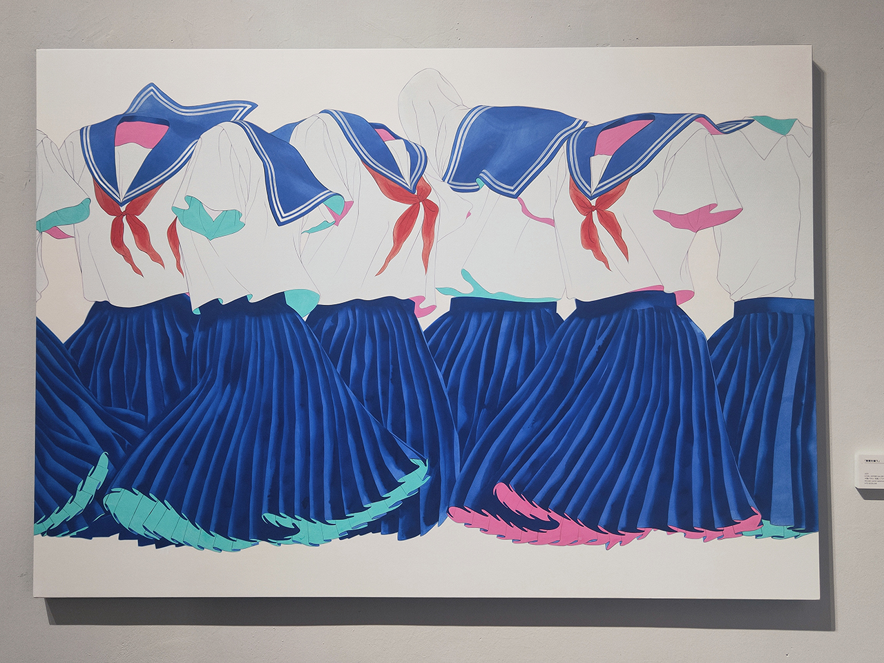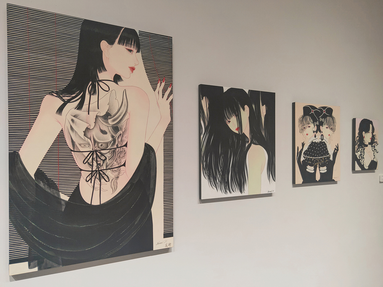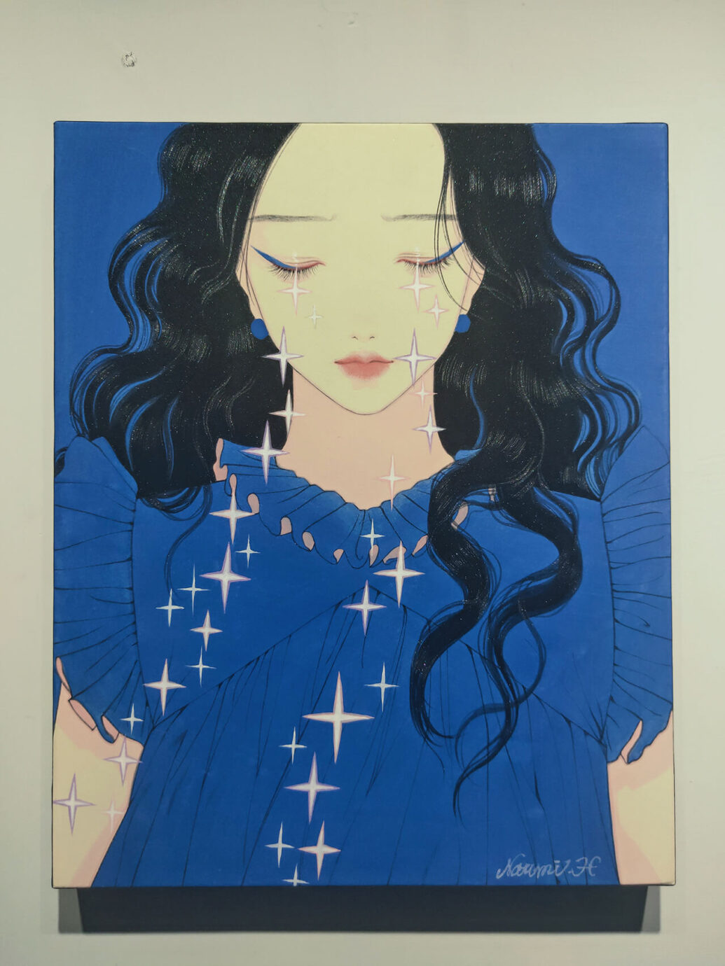現場觀展時,最讓人感到驚喜的便是媒材與畫作的細節,和紙暈染的淡雅色澤、烏黑髮絲上閃爍著細碎的光芒,甚至不同樣貌的少女,髮絲筆觸的基礎色調也會不同(有的是紅色,有的則是綠色)