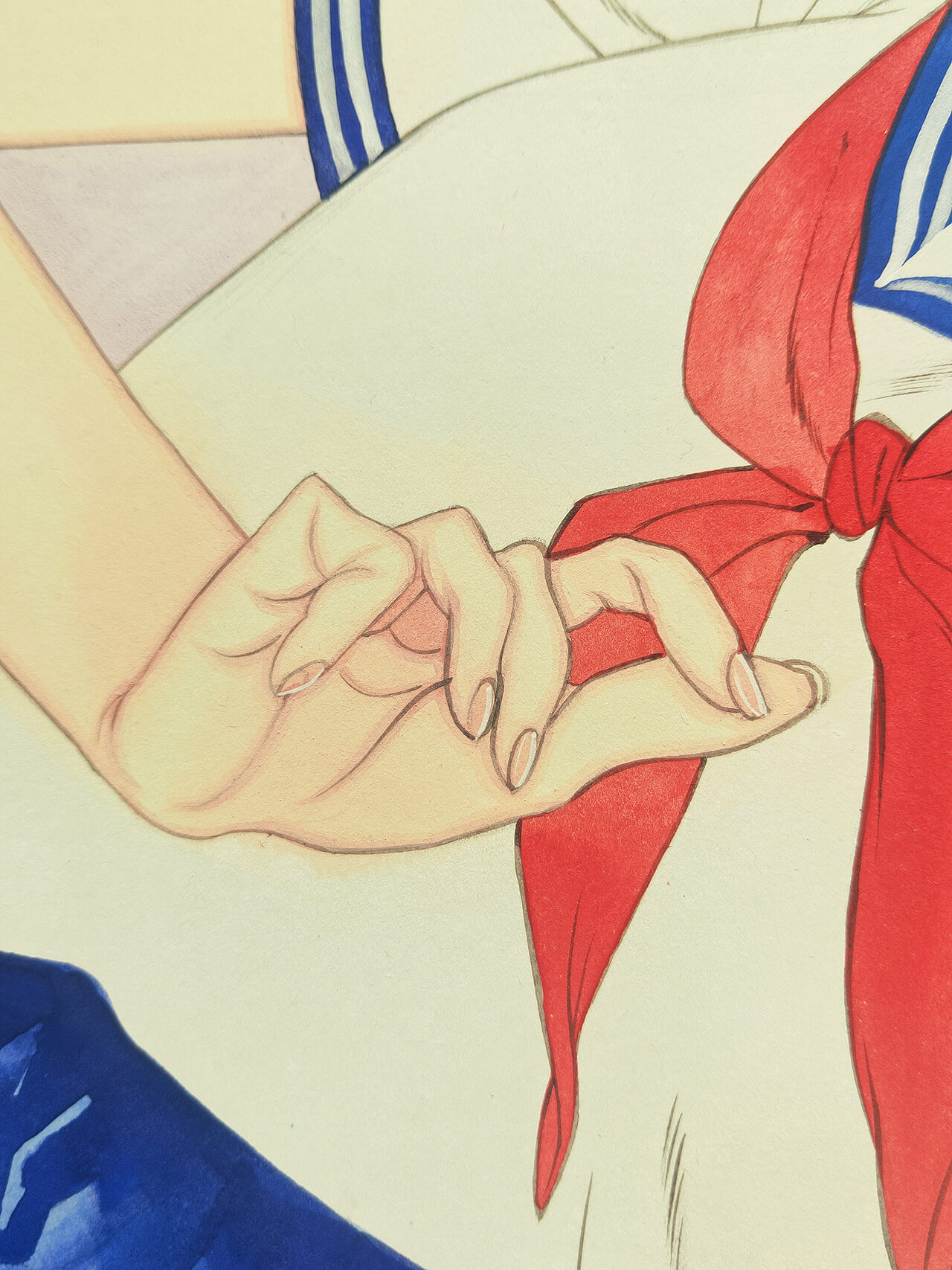 除了顏色與頭髮外,面容也有著淡淡的亮色,像是在幫畫中的少女化妝一般,眼周都有著似眼影般點綴的亮色,這些小細節都是從螢幕圖片上所看不出來的,也是現場看原畫的有趣之處呢!