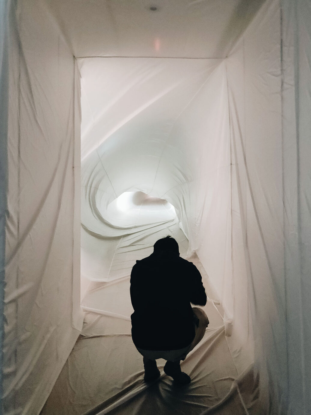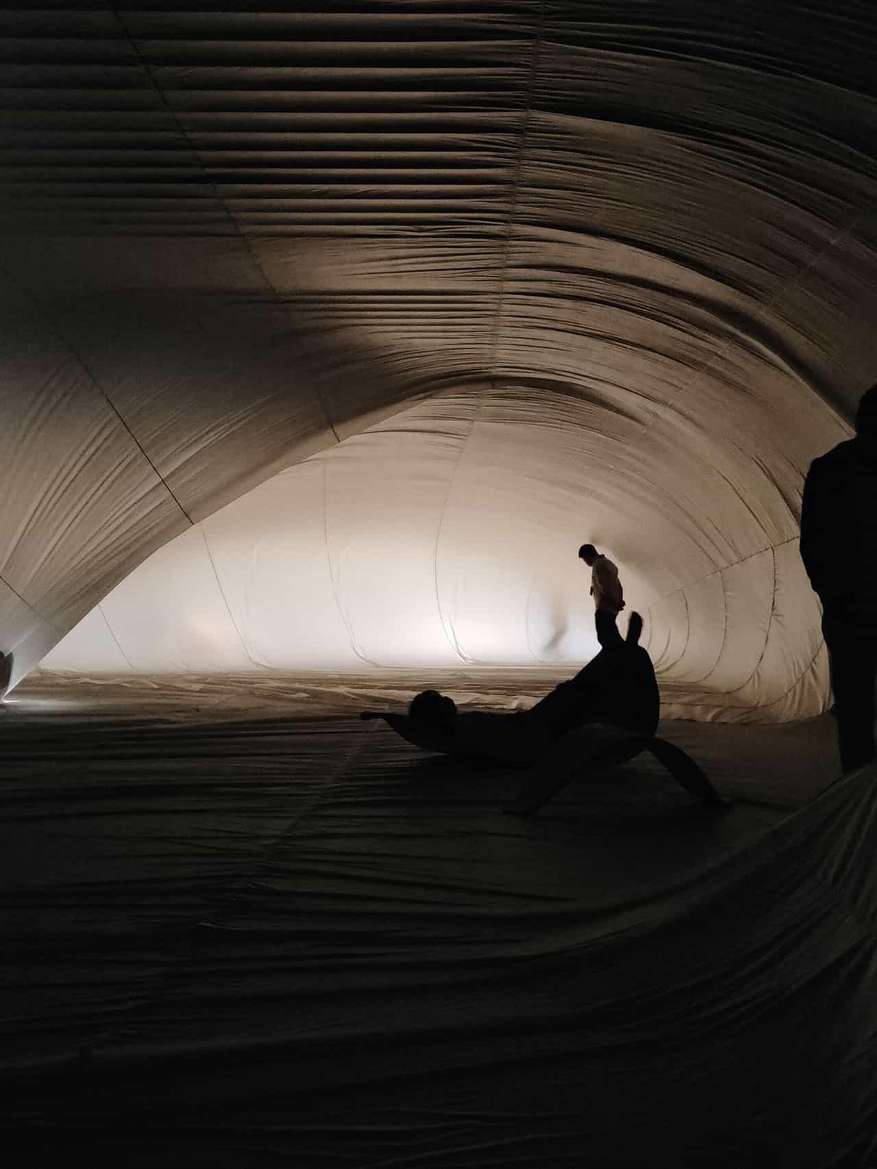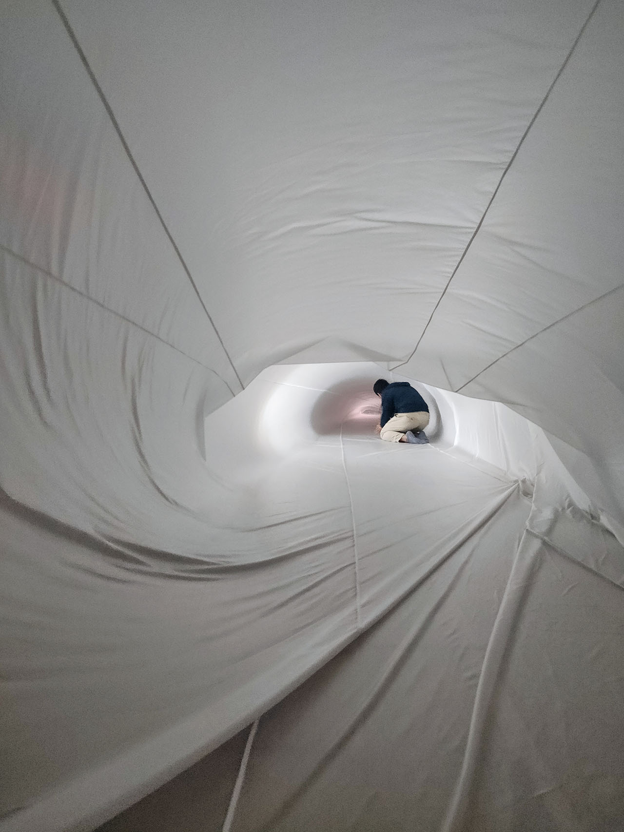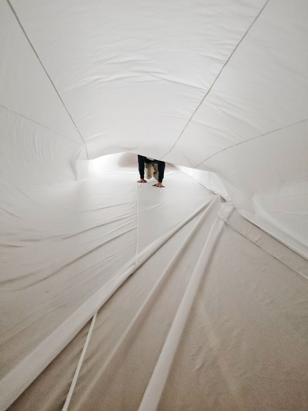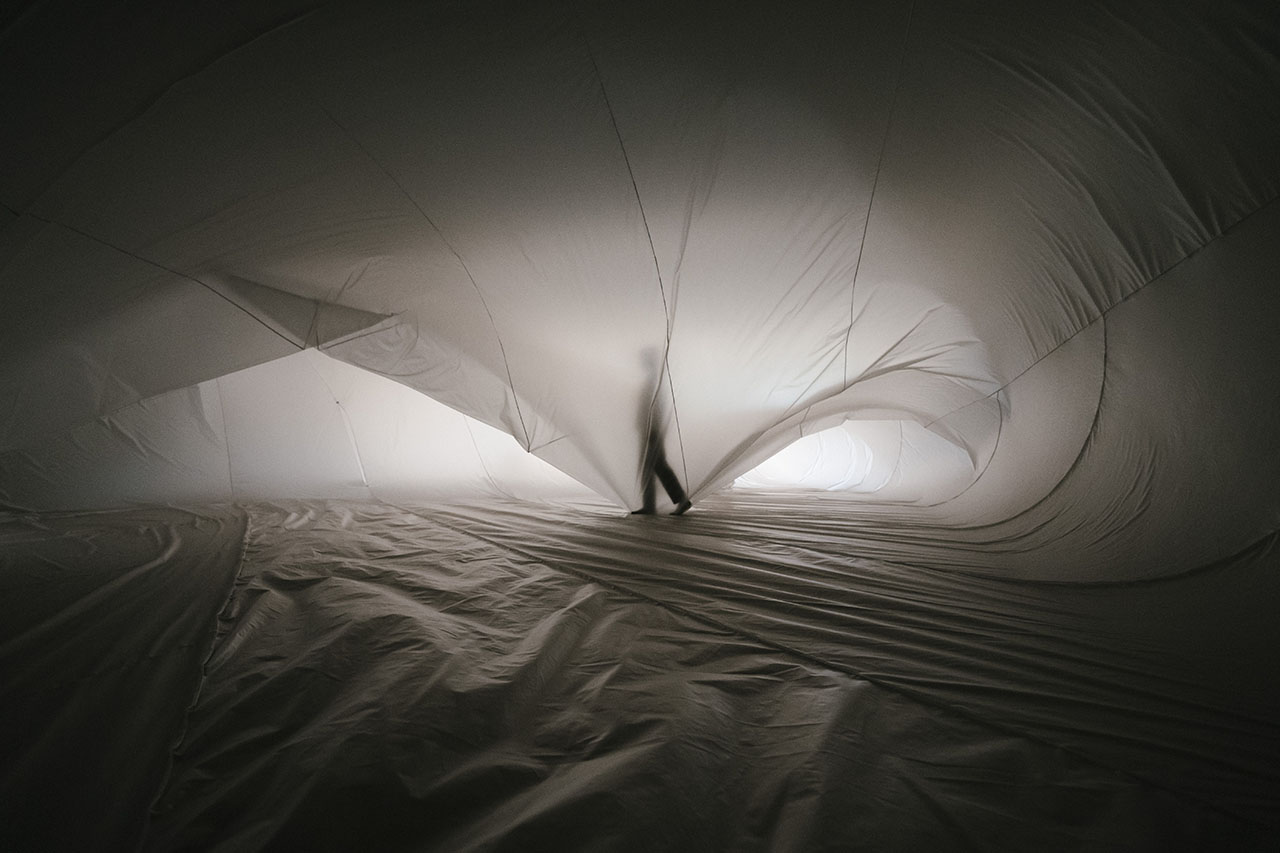 藝術家的創作多是不同樣貌、大小的充氣裝置,每當觀眾走進柔軟的充氣空間時,又能夠感受到不同的身體感知與經驗,這一點一直讓人覺得特別有趣!