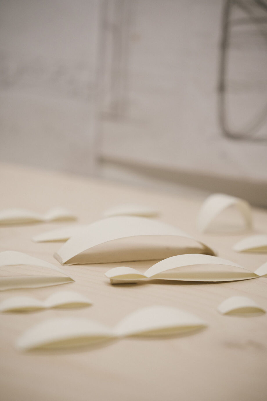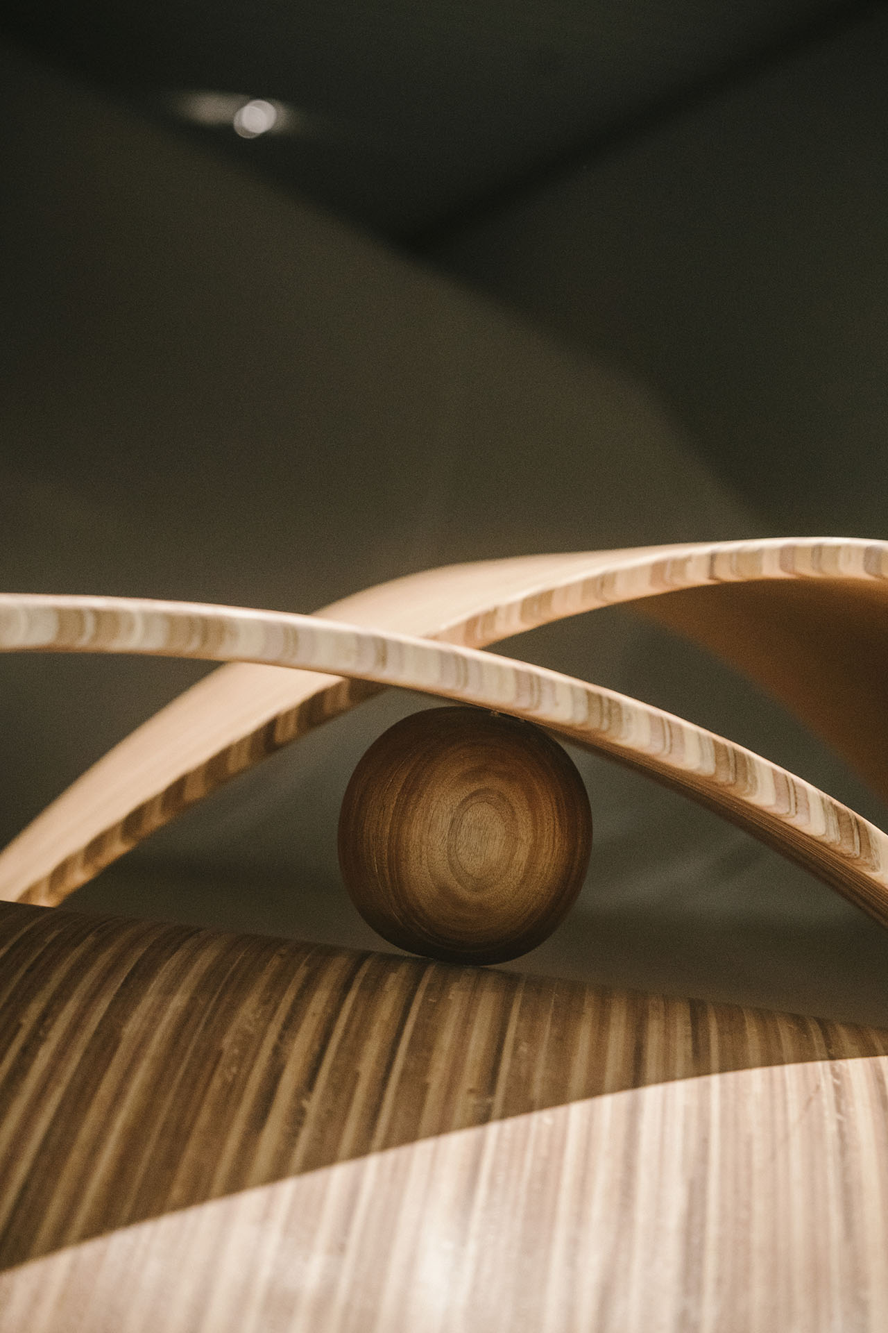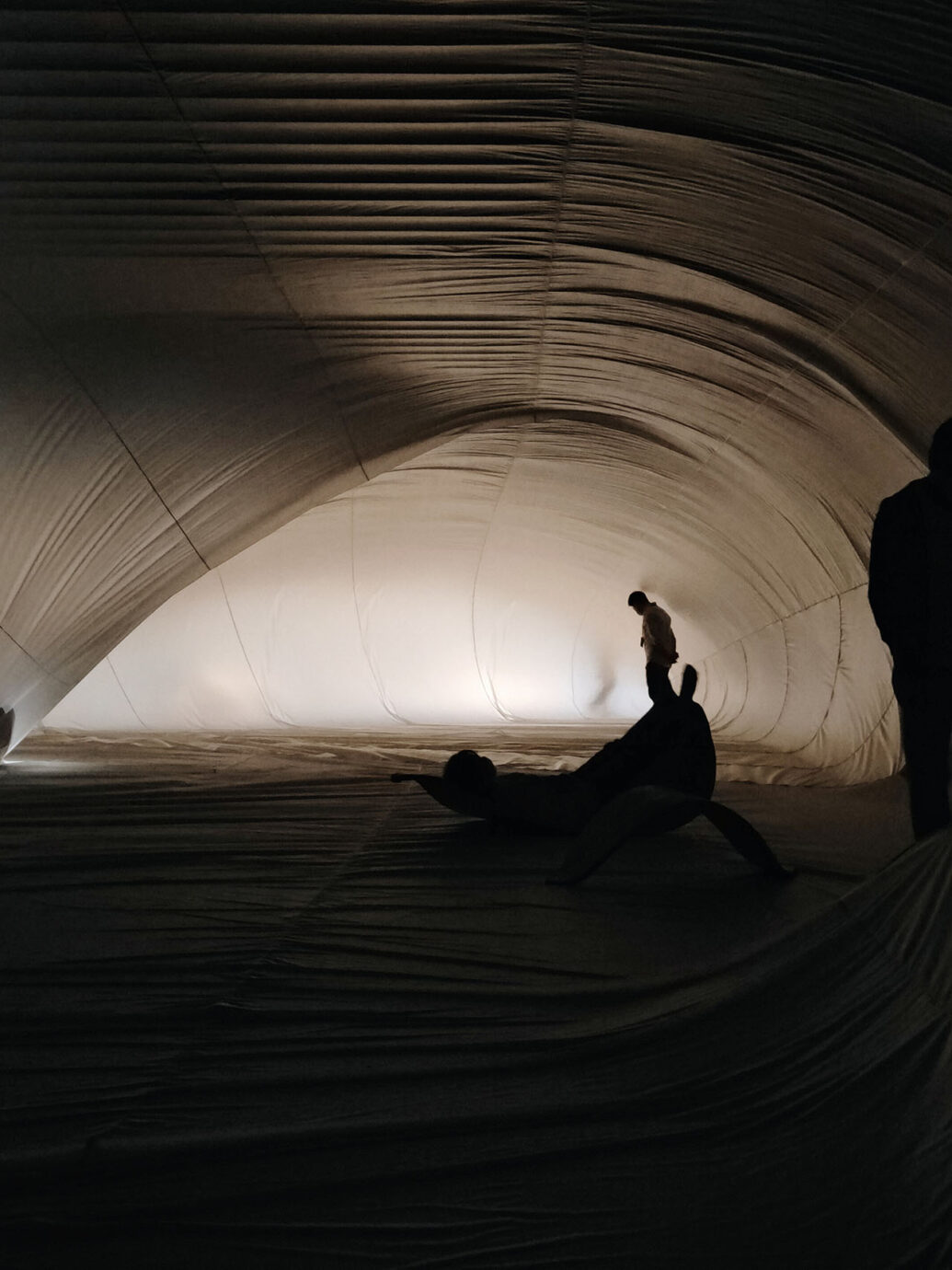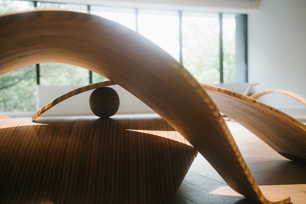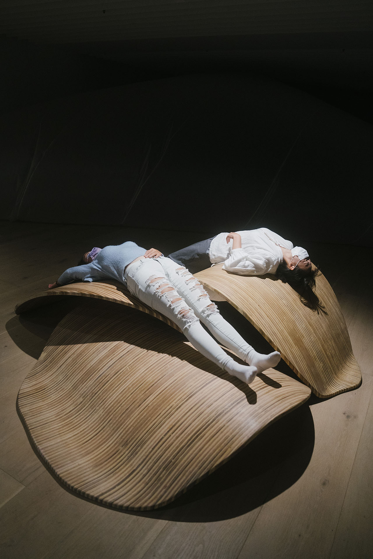 此次不只有充氣裝置,同時有建築師林柏陽的作品在其中,似葉片般圓滑的木製裝置,讓觀眾能在空間裡坐下、躺臥、搖擺,同樣以最柔軟的姿態參與這場展覽。