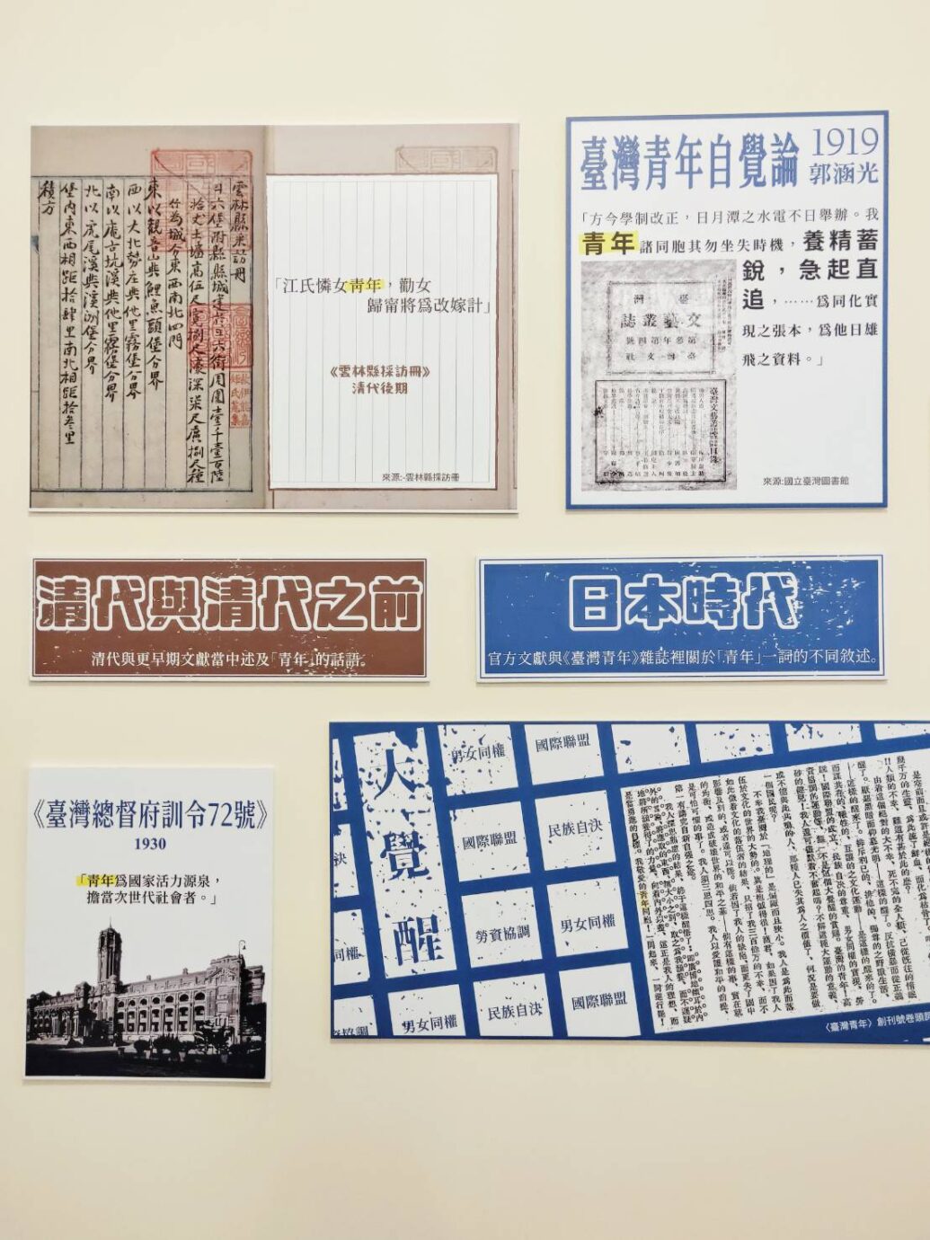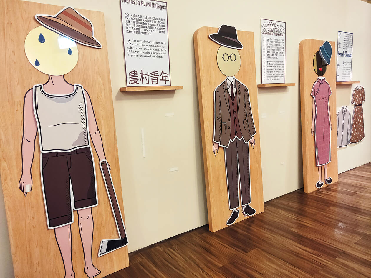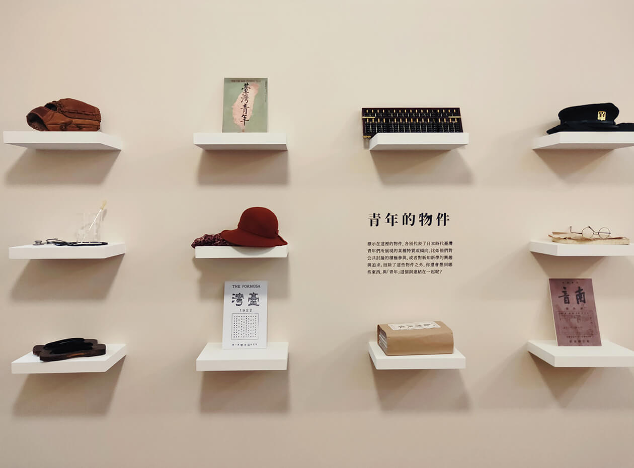 展覽一開始就從「青年的想像」切入,先不談歷史,而是先想像這些青年的樣貌,擺放了當時青年可能穿戴的物件,像是台灣民報、書籍、流行服飾等等;而另一種比較有趣的呈現,則是從各個文本、雜誌上截取「青年」的文字,讓大家看到不同文本下,關於青年「文字」上的詮釋與變化。