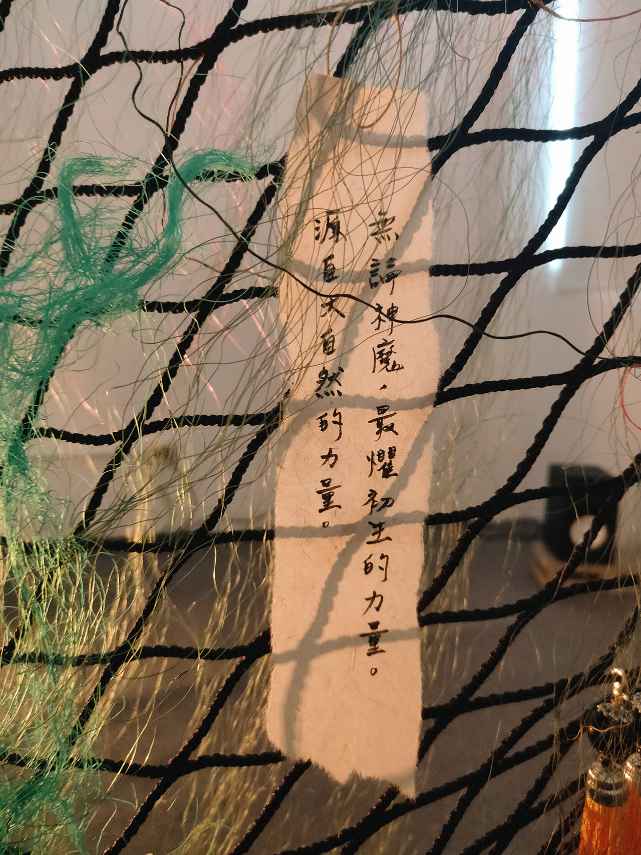 在這場展覽裡,女子個人最喜歡的作品,反而是最不容易被留意且沒有實質形體的「聲音」,在漁網作品之後,有兩個人談話的聲音持續迴盪於展間中。