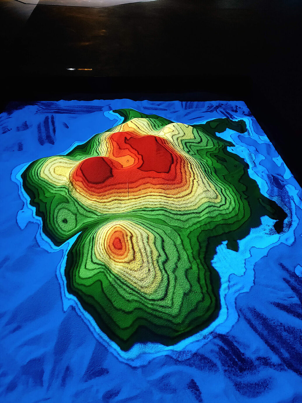 你可以將沙子所堆出高山變為平地,又或是在投影的海面上堆疊出一座小島。原本是標記山坡高低的等高線,卻因為觀眾的參與,讓等高線是持續流動且持續變化的狀態。