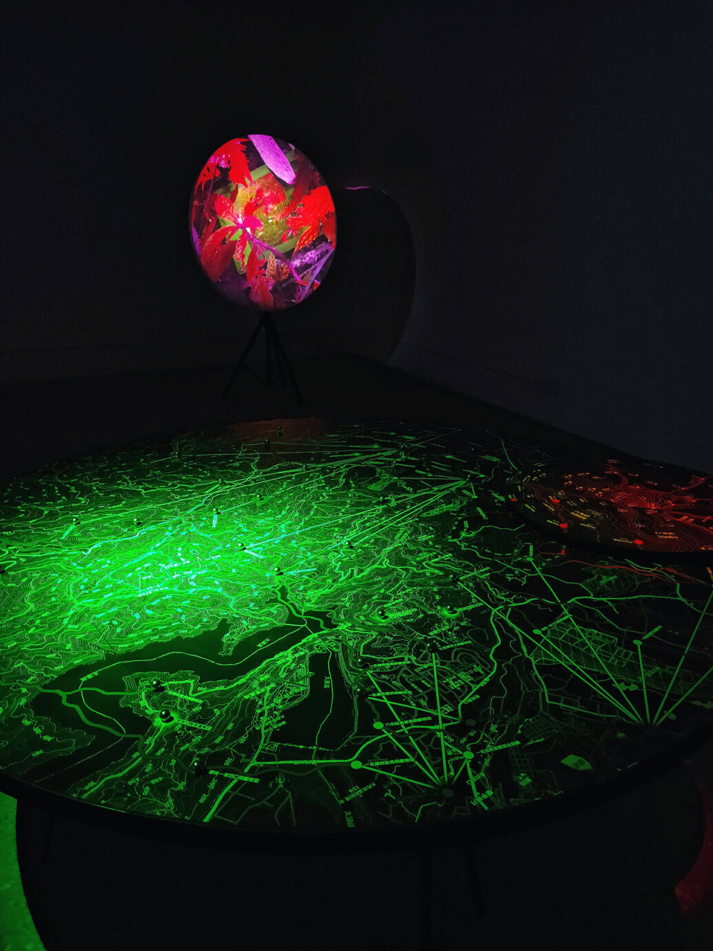 一旁也以錄像及影像紀錄的方式,敘說過往原住民與漢人衝突的故事,錄像的火光、顏色,也讓空間產生一種靈異感,這裡的地圖更多了一些政治、生死的意象。