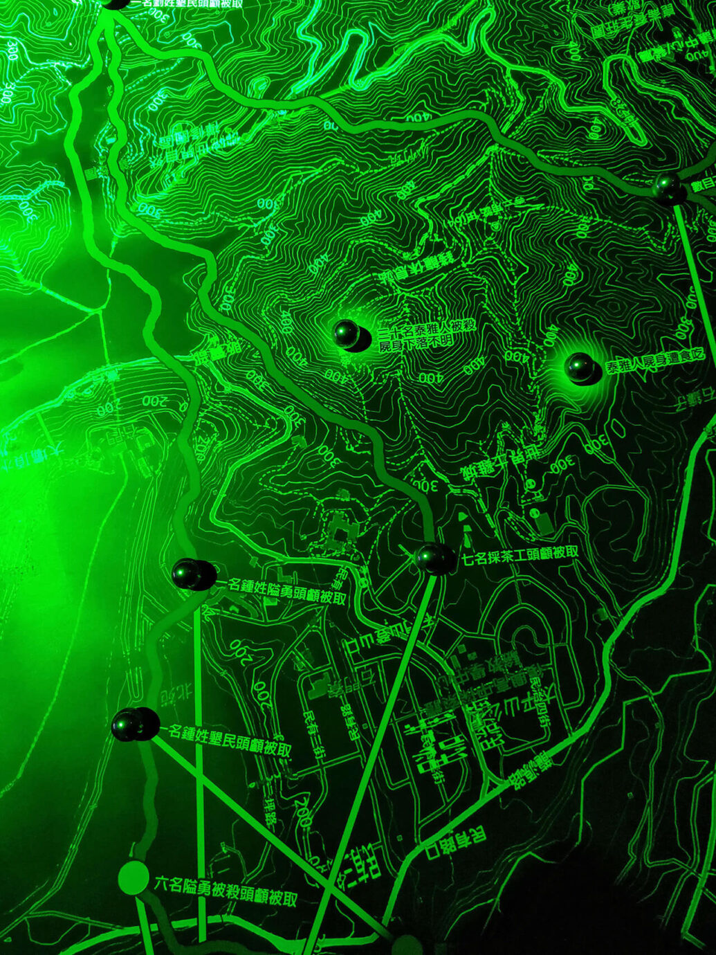 除了像遊戲般的地圖外,也仍有比較寫實的地圖,不過標記的不是地點,更像是在標記靈魂,在異色的燈光下的《眾靈之域》地圖,標記的是過去隘勇被原住民取頭顱的地點。