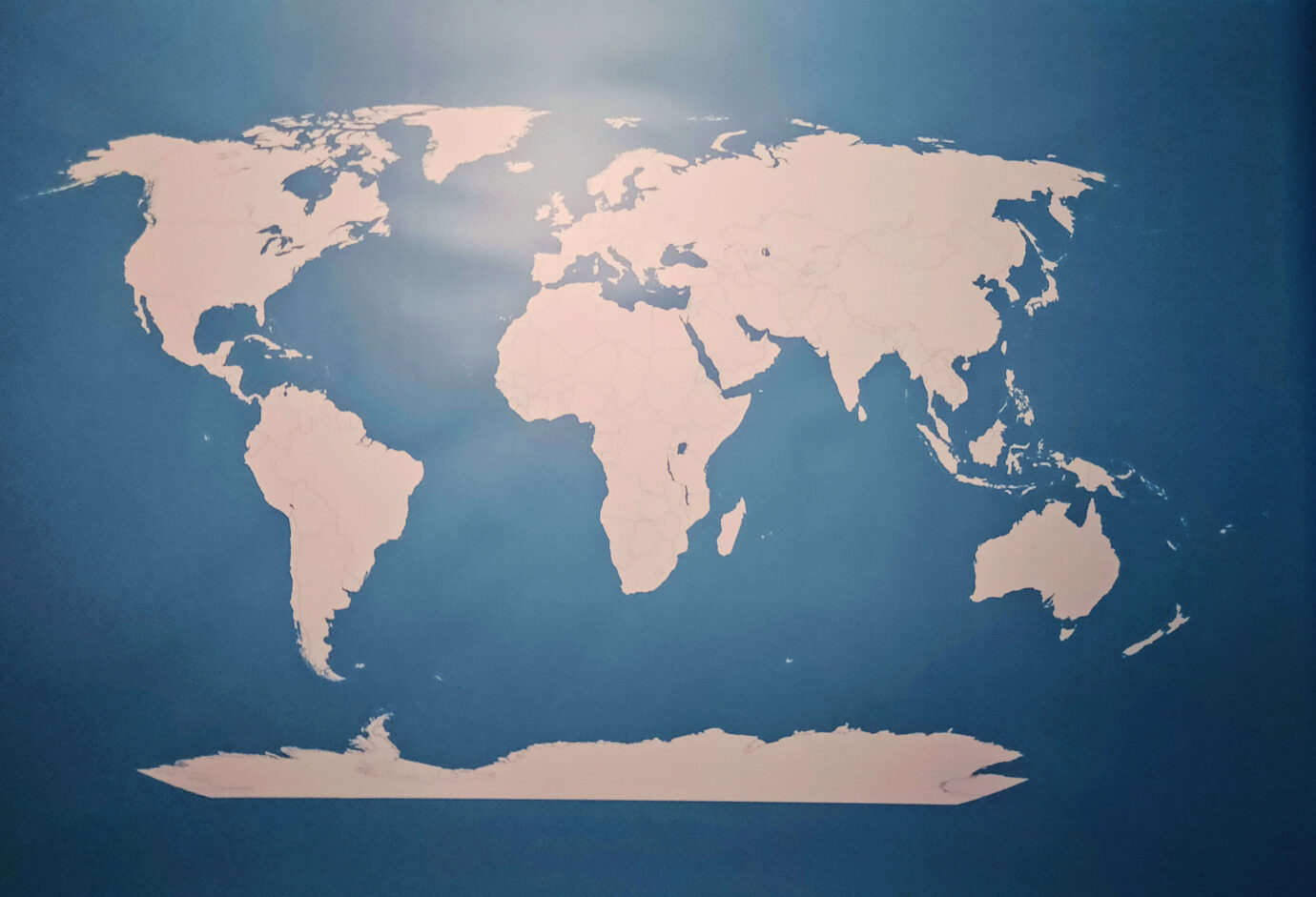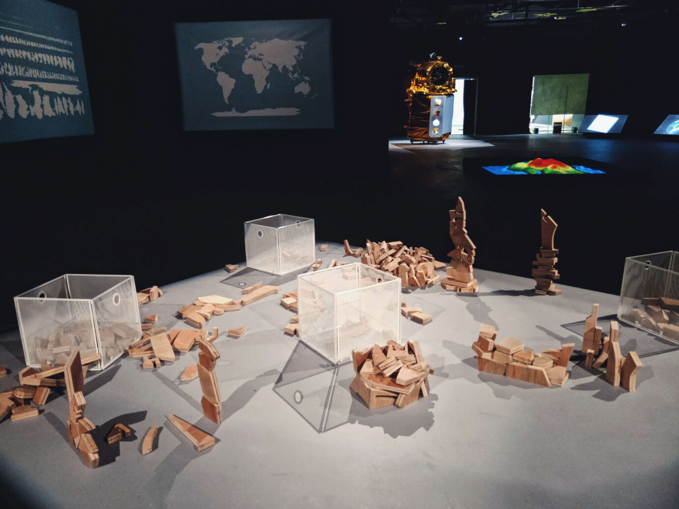 《世界排列》將世界地圖上的五大洲及島嶼拆成碎塊,並將這些碎塊變成像積木一樣,放置放於展場,讓觀眾可以自由堆疊、組裝。