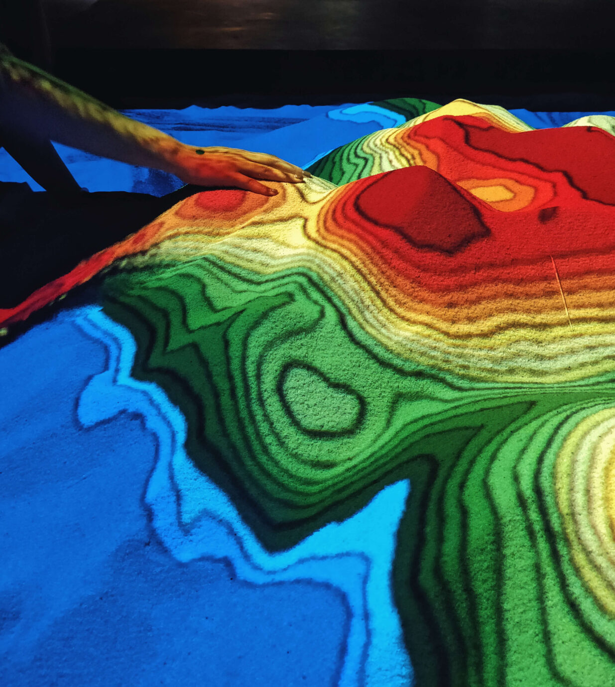 《擴增實境互動沙盒》則是透過沙子與等高線投影,讓觀眾透過堆沙的方式,自由改變等高線的高低。