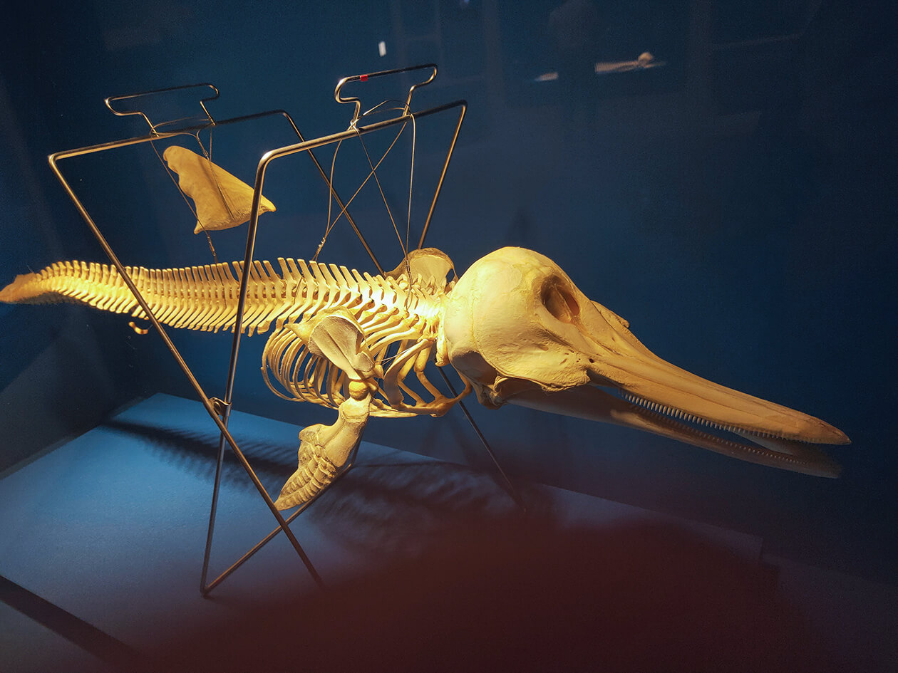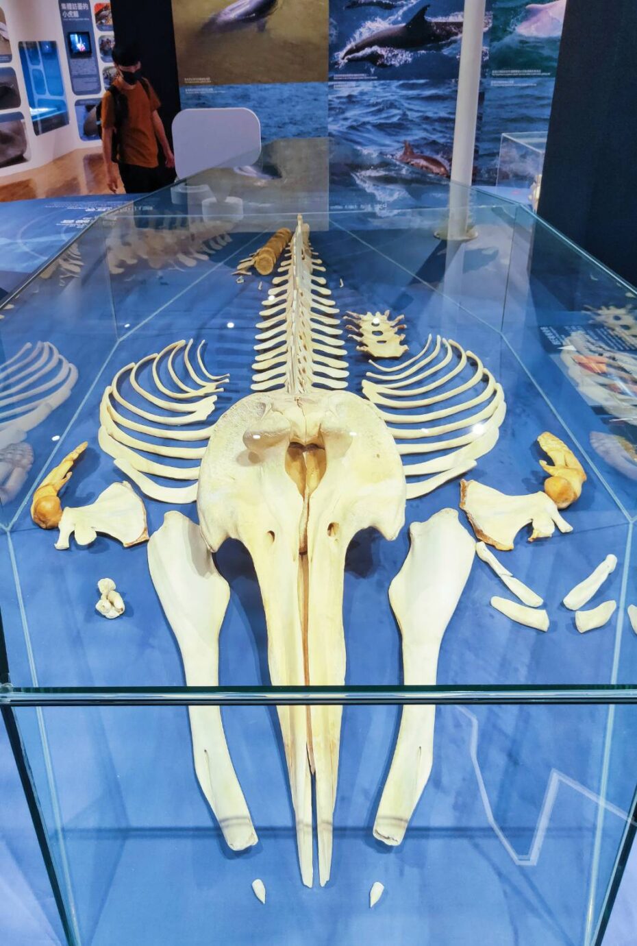最後展覽在談到鯨豚保育時,也展示了現代生活對鯨豚的影響,不管是大量的海中垃圾,還是風力發電的噪音,都是鯨豚在海中生活的難題,影片中的保育員也提到,每年擱淺上岸的案例中,因為吃了太多垃圾而死亡的鯨豚也越來越多,甚至從現場展示的骨頭中,都可以看到海豚被線條緊勒的痕跡。